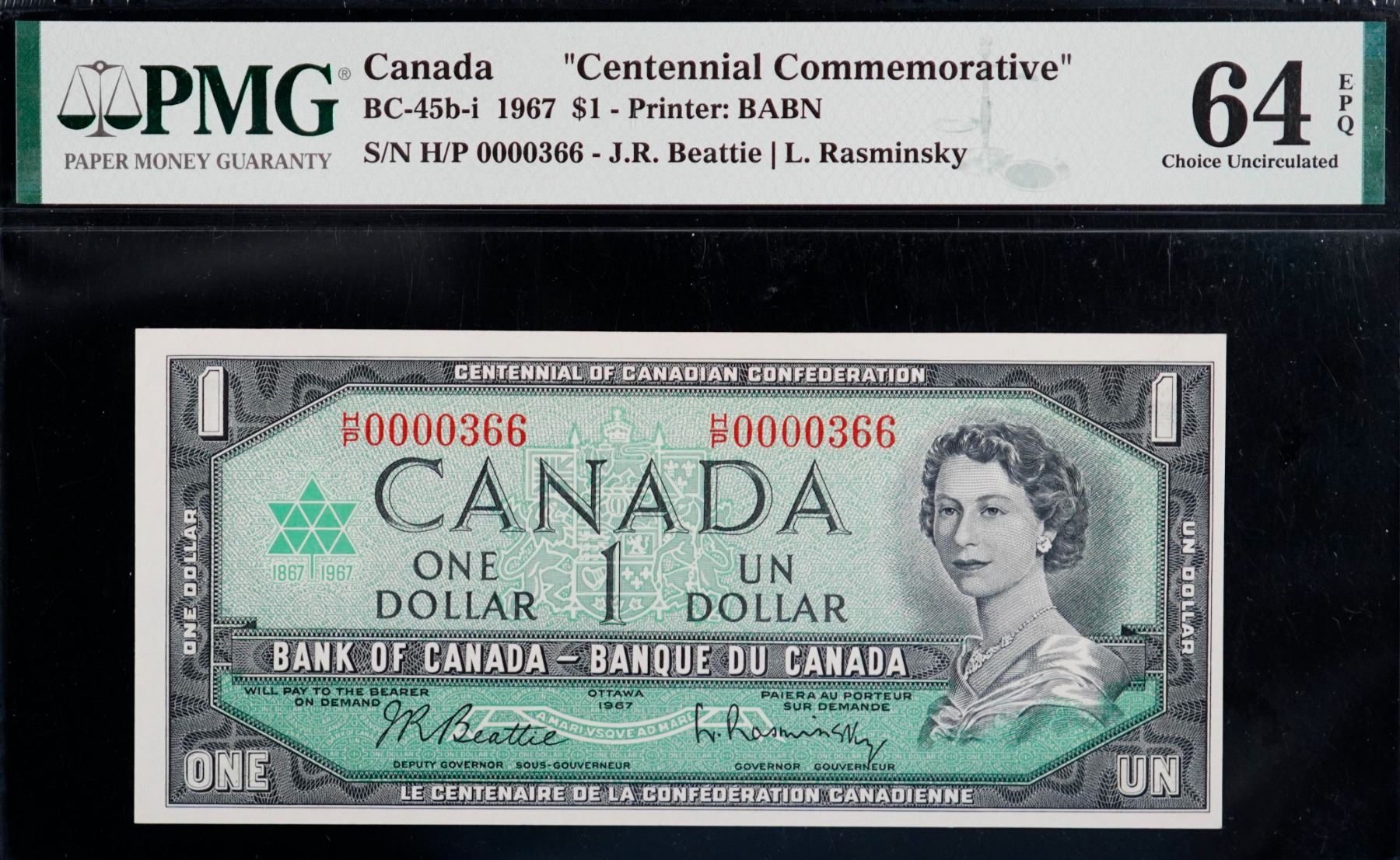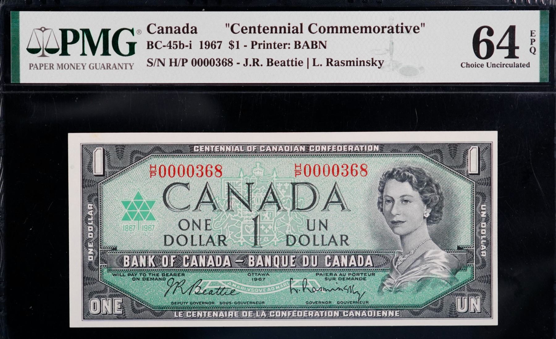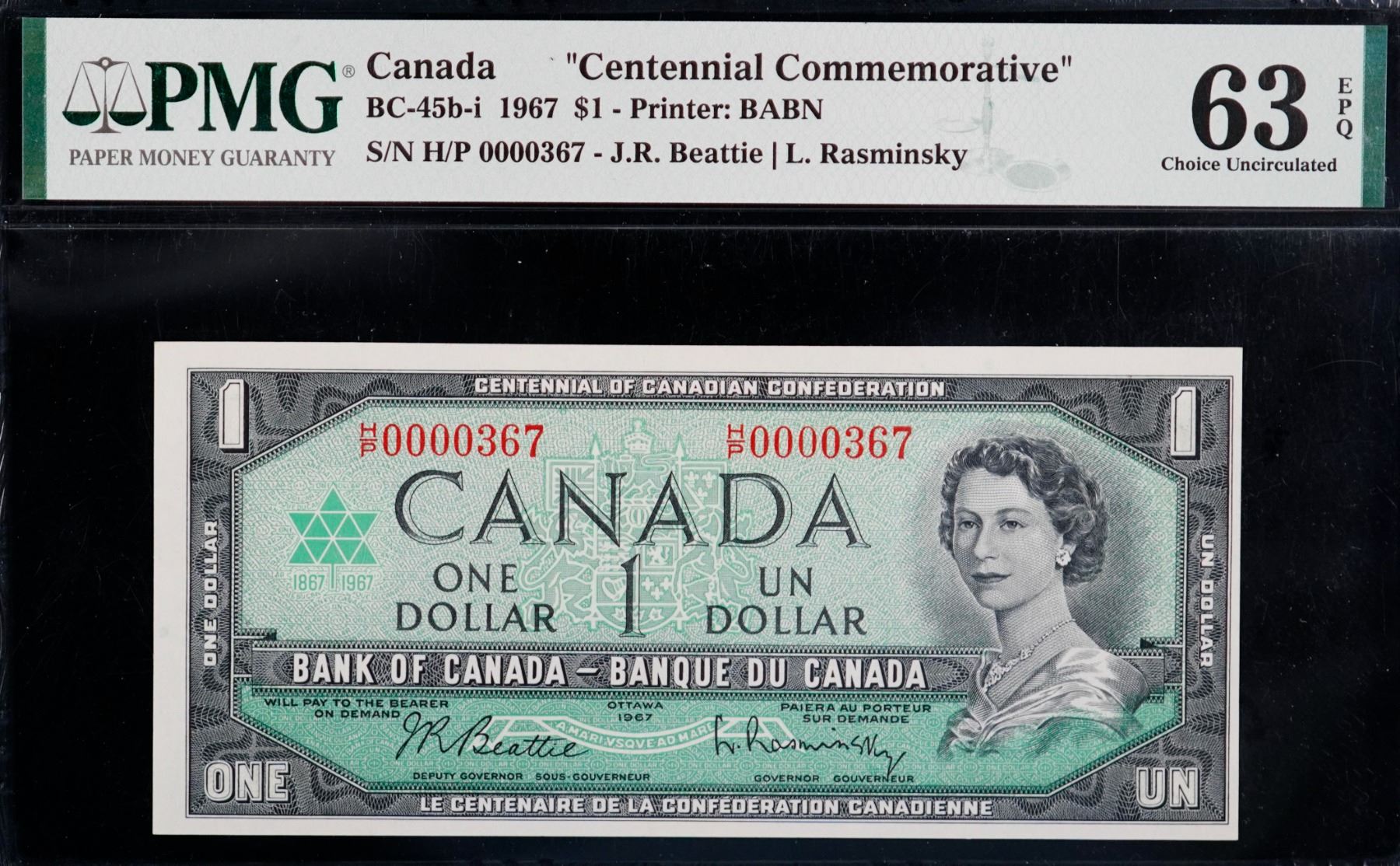 Low Numbers; 1967 $1 BC-45b-i H/P0000366-367-368, all 3 notes PMG Choice Uncirculated-63PPQ & Choice Uncirculated-64PPQ