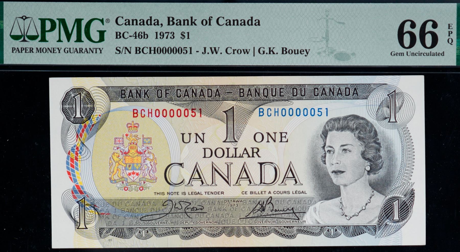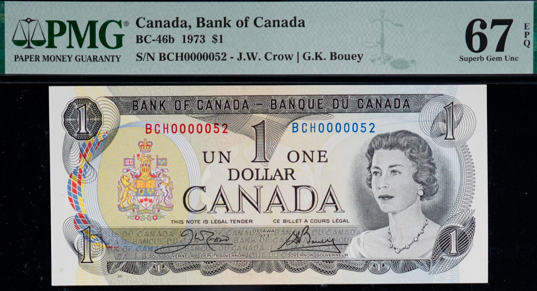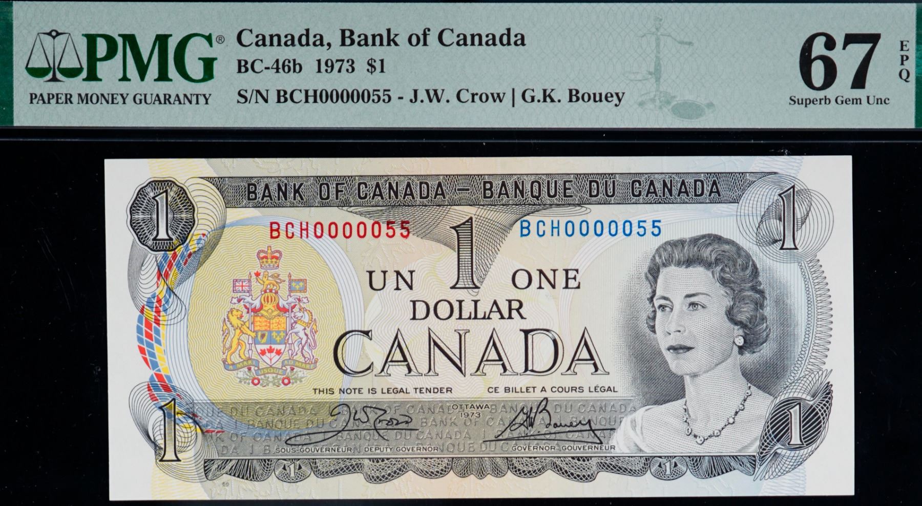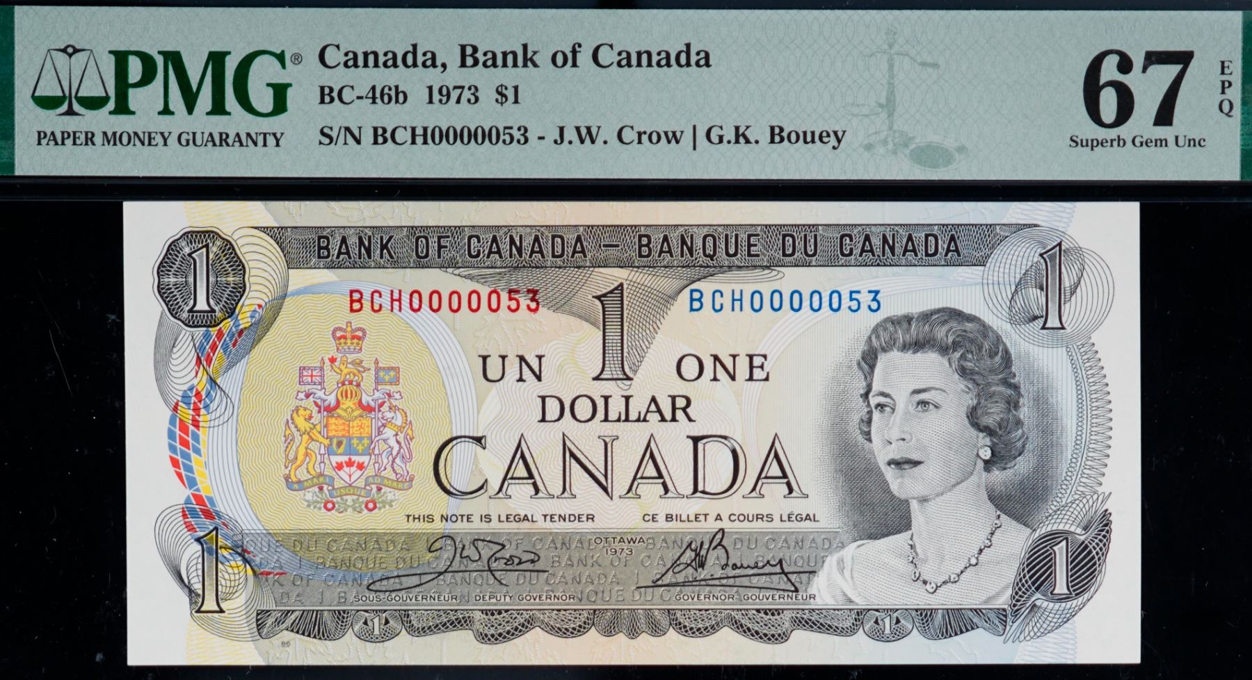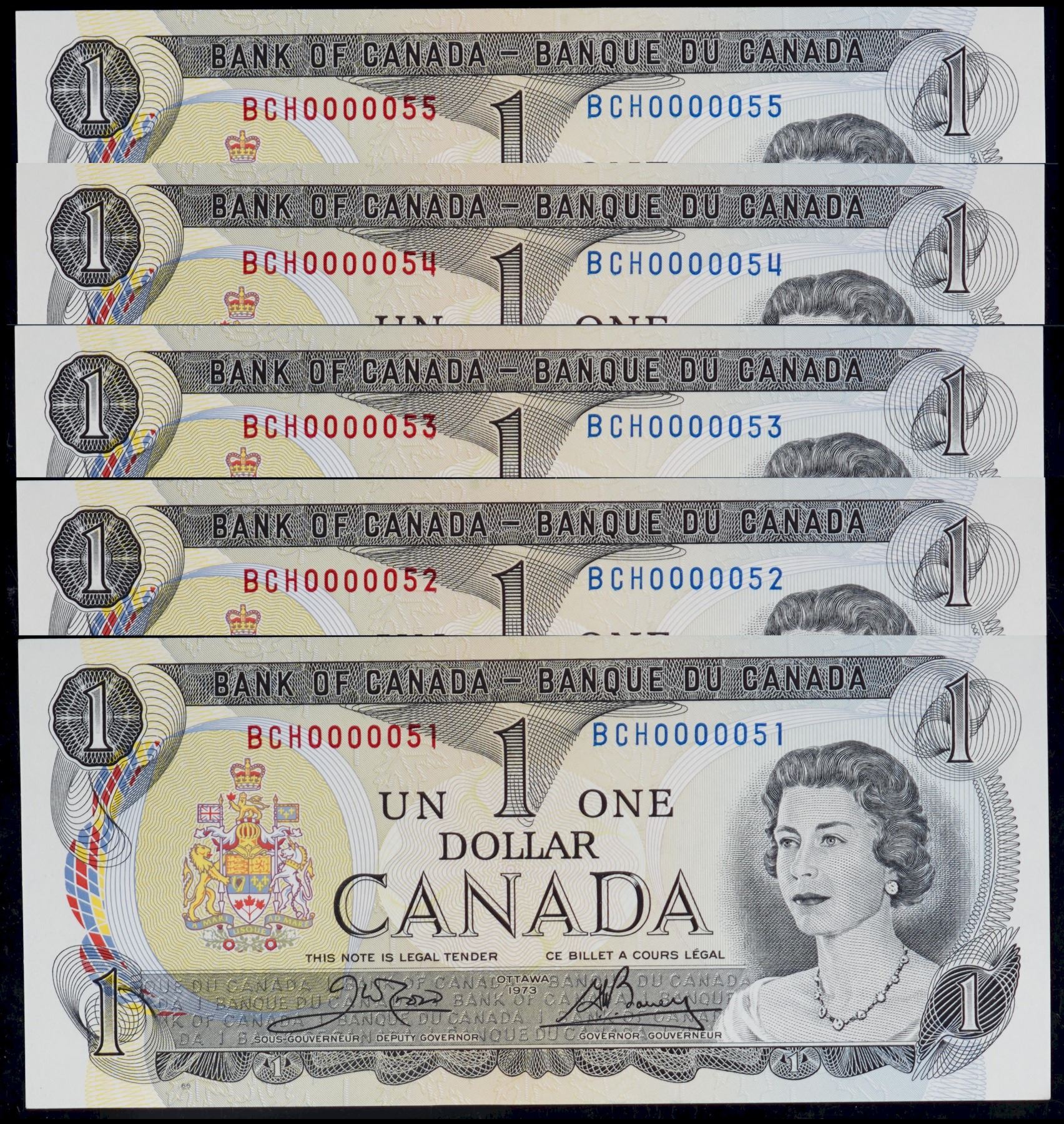 Low Numbers; 1973 $1 BC-46b #BCH0000051 to 0000055. All 5 notes PMG Superb Gem Uncirculated-66PPQ to 67PPQ.