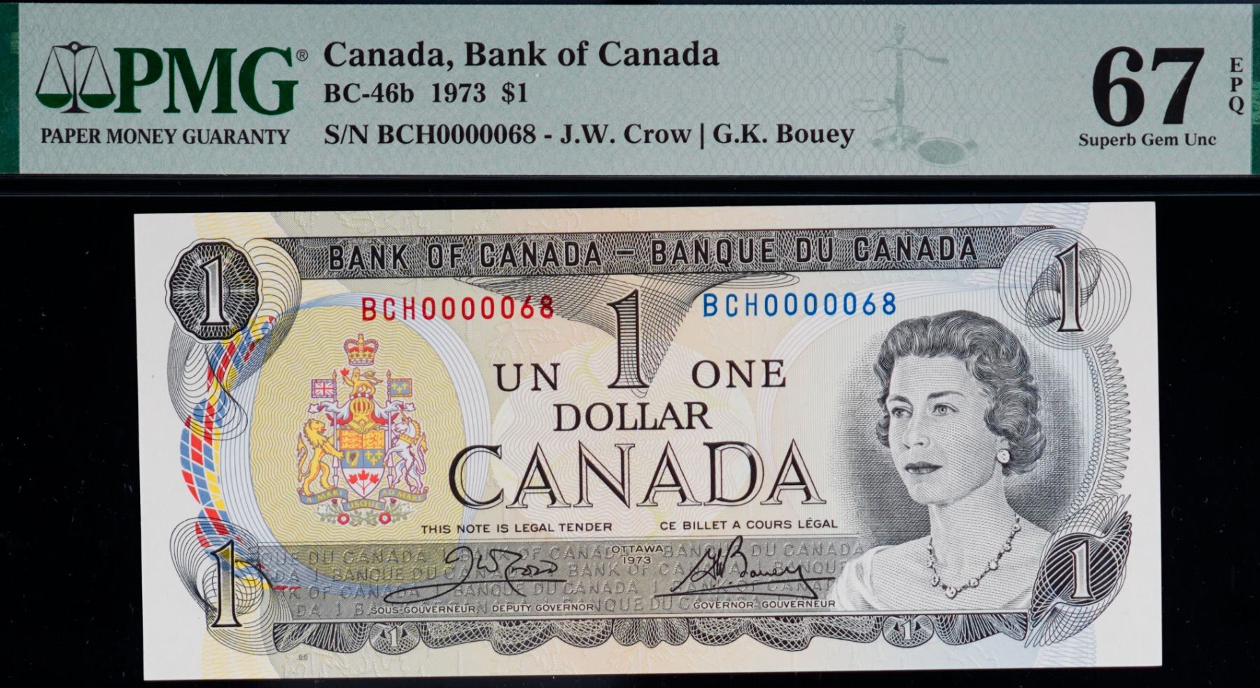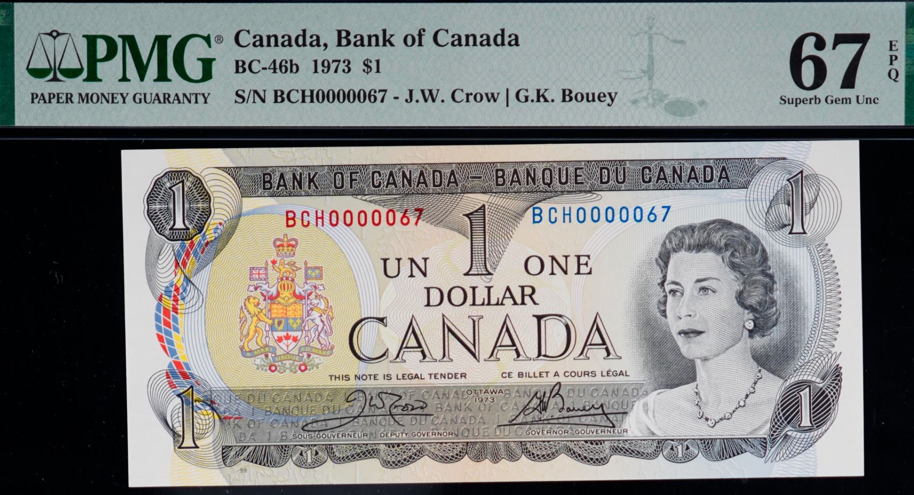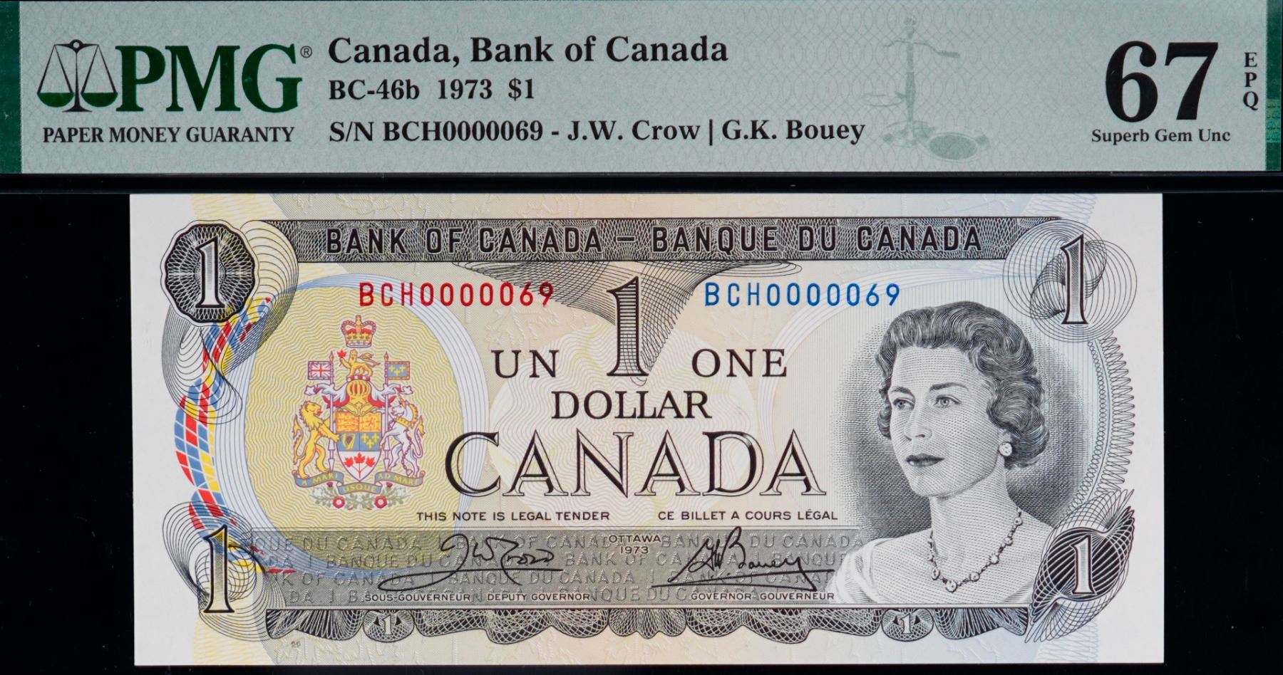 Low Numbers; 1973 $1 BC-46b #BCH0000066 to 0000070. All 5 notes PMG Superb Gem Uncirculated-67PPQ.