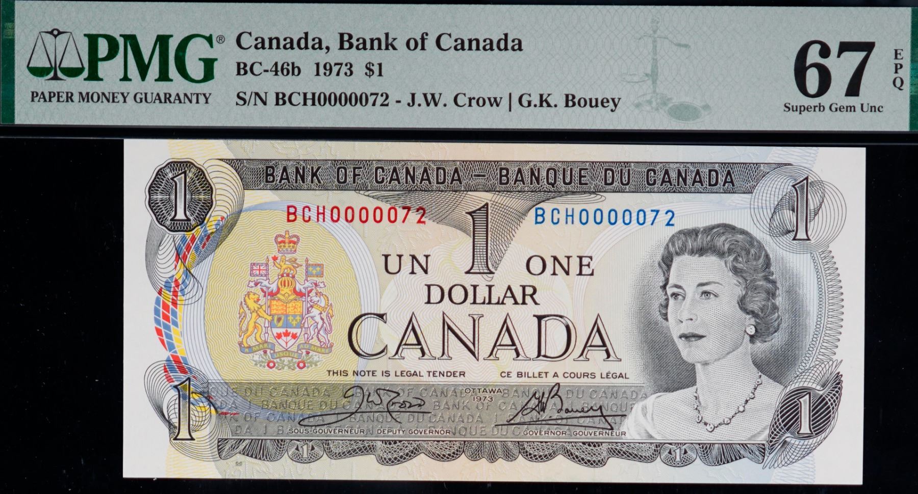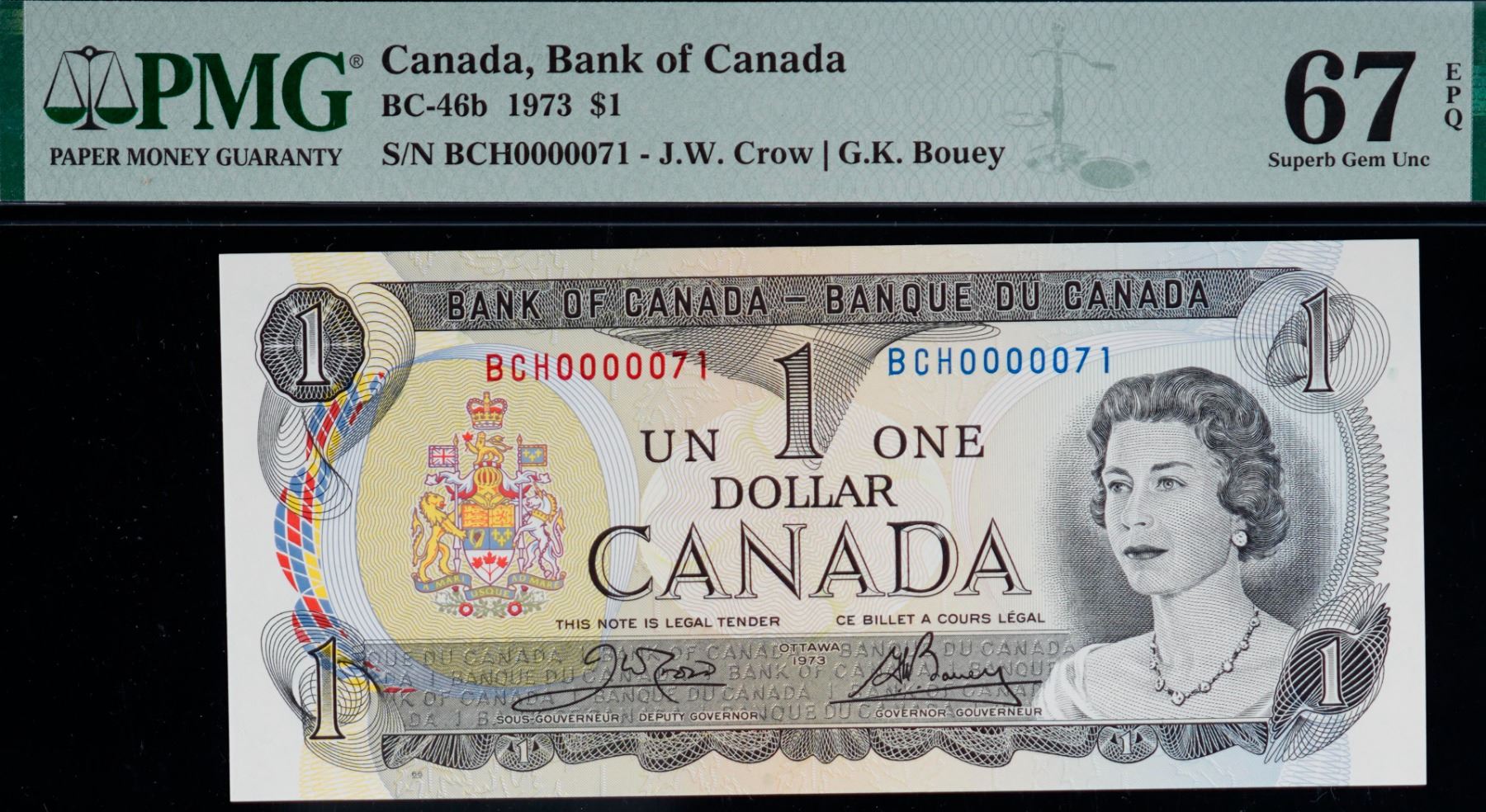 Low Numbers; 1973 $1 BC-46b #BCH0000071 to 0000075. All 5 notes PMG Superb Gem Uncirculated-67PPQ.
