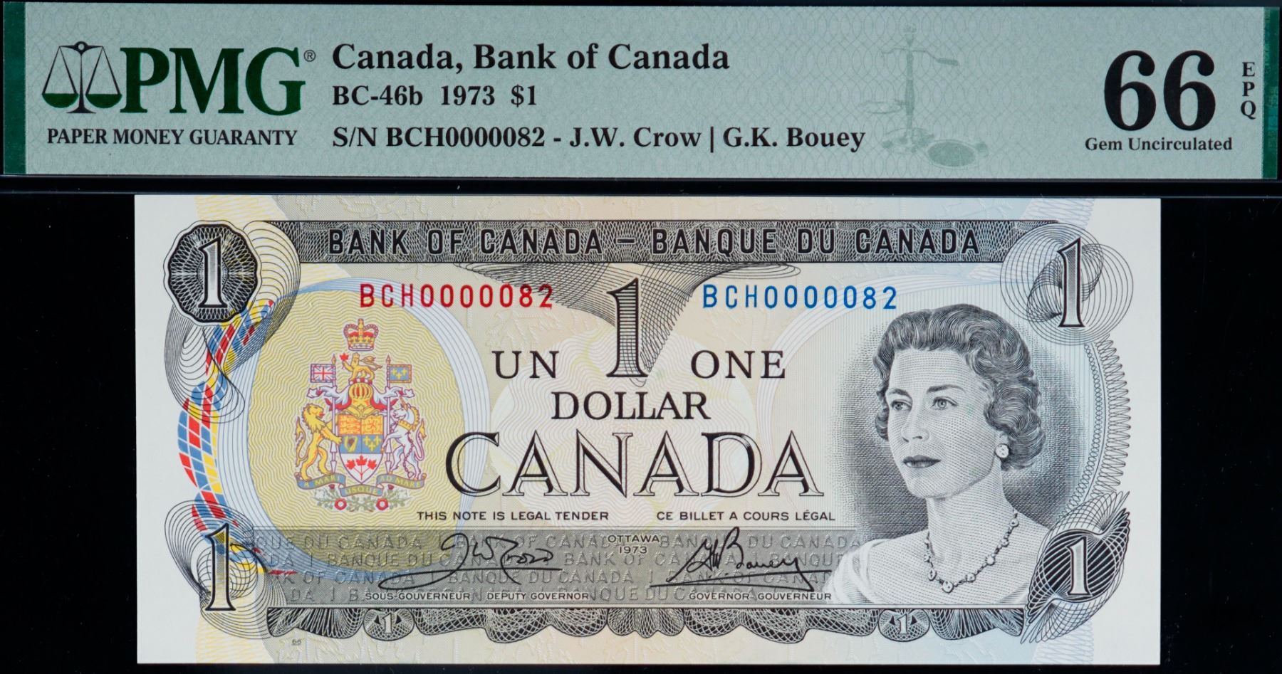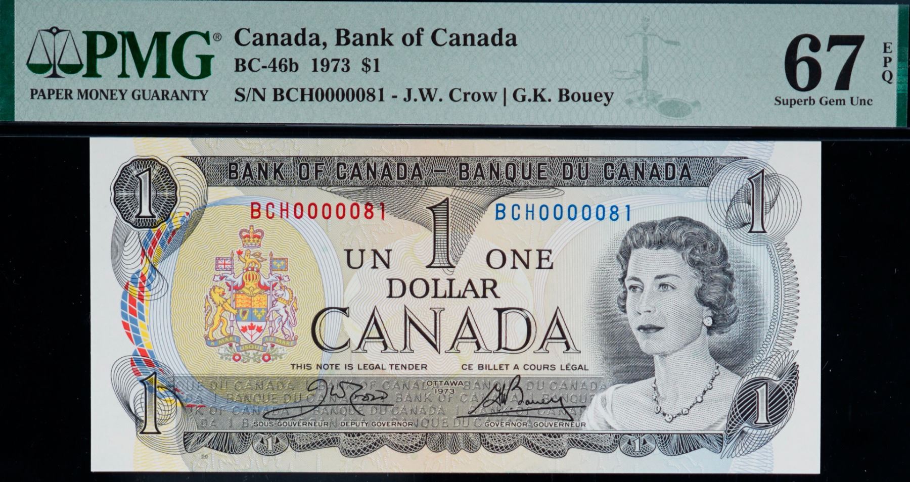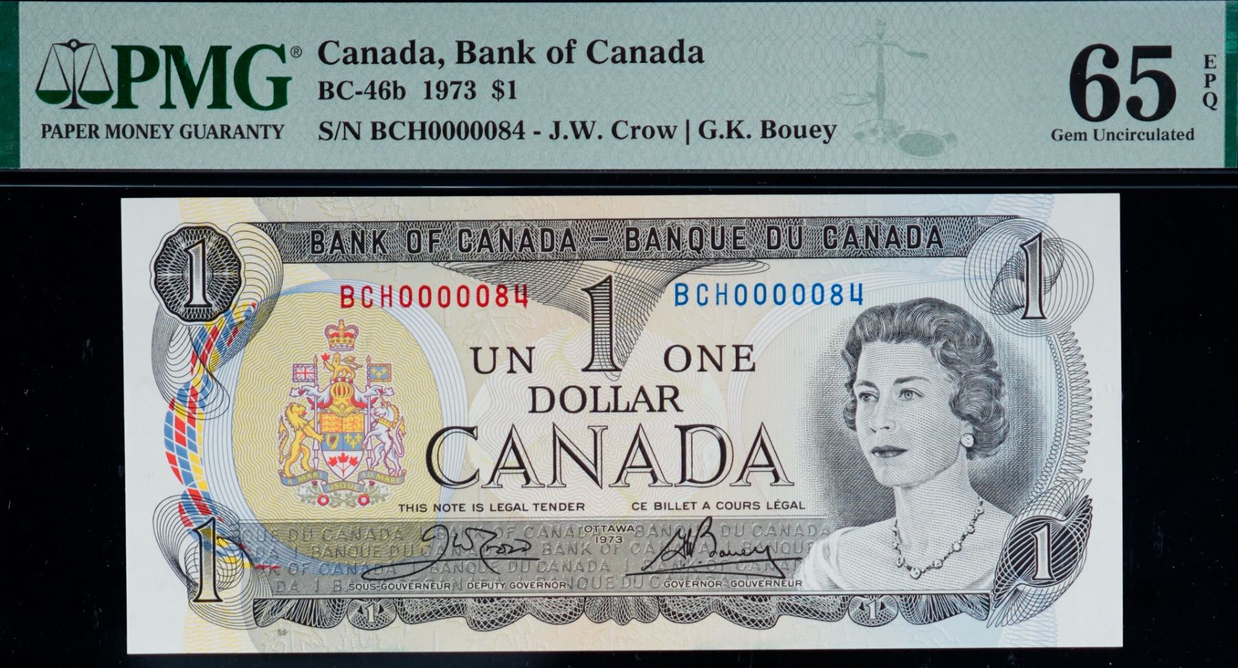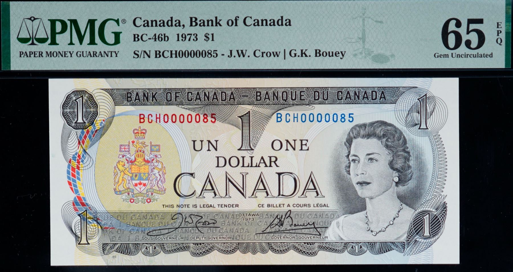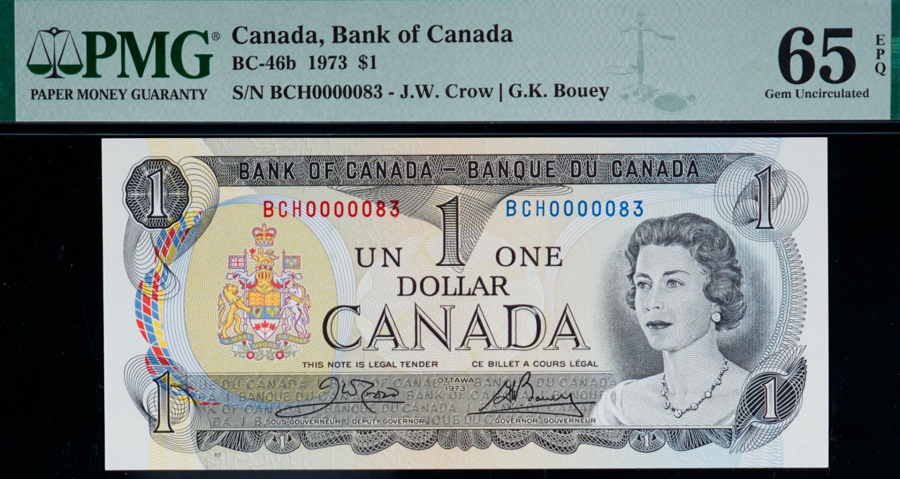 Low Numbers; 1973 $1 BC-46b #BCH0000081 to 0000085. All 5 notes PMG Gem Uncirculated-65PPQ to 67PPQ.