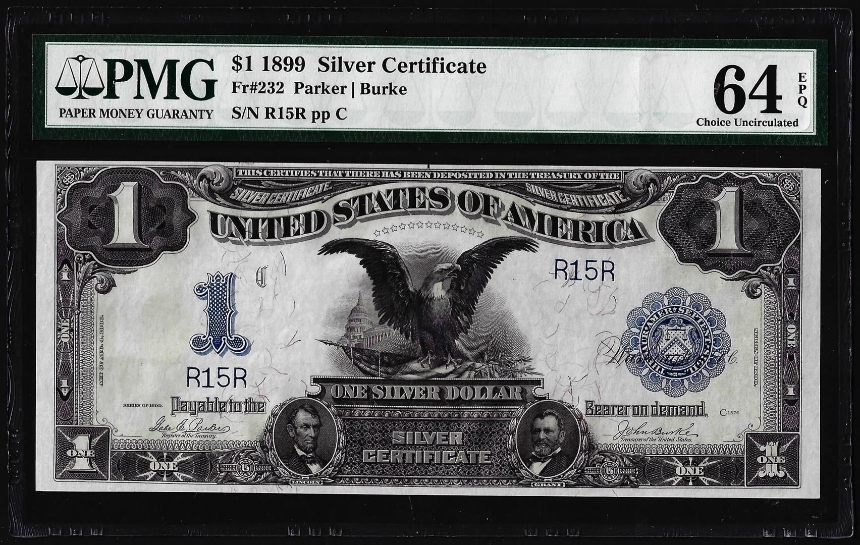 One Low Serial # 1899 $1 Black Eagle Silver Certificate Note PMG Choice Uncirculated 64EPQ. PMG Certified.