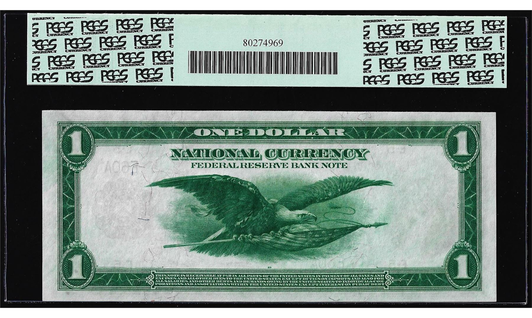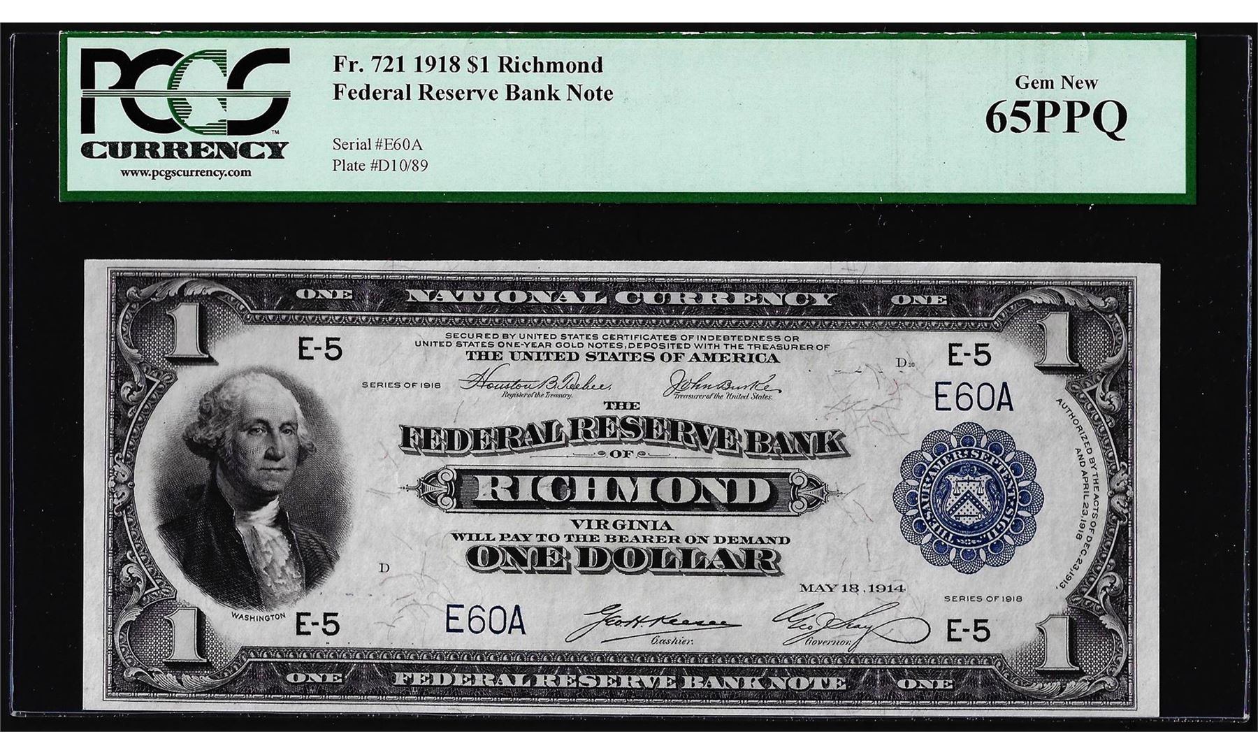 One Low Serial 1918 $1 Federal Reserve Bank Note Richmond Fr.721 PCGS Gem New 65PPQ. PCGS Graded.