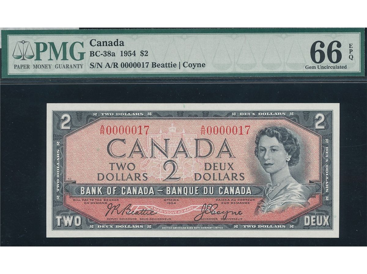 Low Serial; 1954 $2 BC-38a #AR00000017, PMG Gem UNC66EPQ.