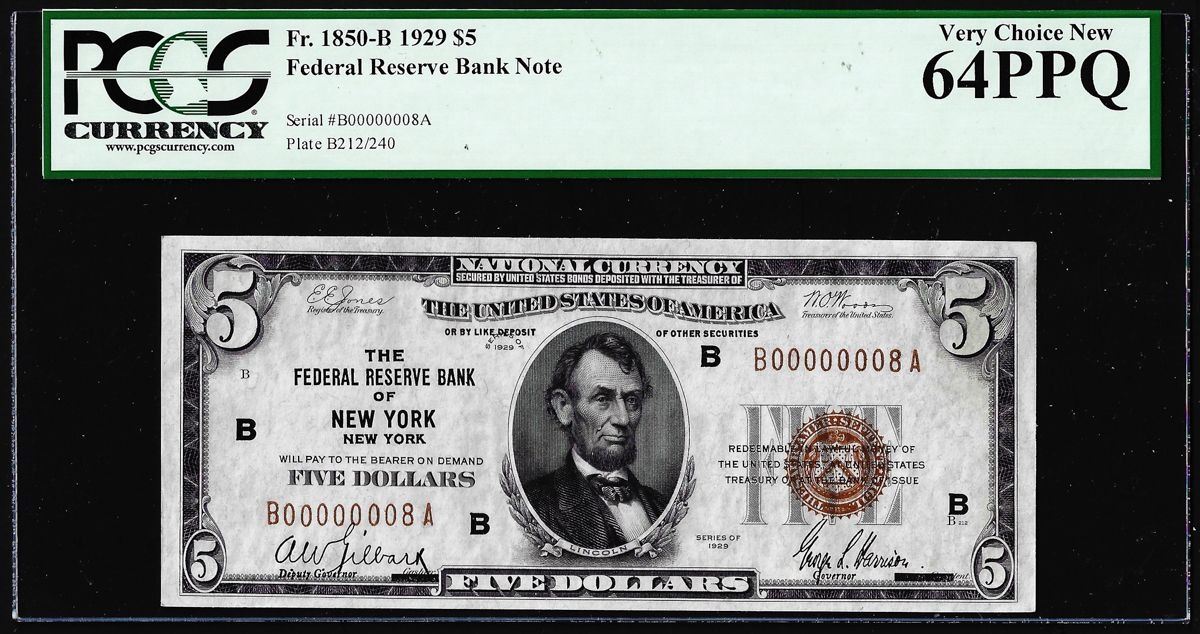 One Low Serial #8 - 1929 $5 Federal Reserve Bank Note New York PCGS Very Choice New 64PPQ.