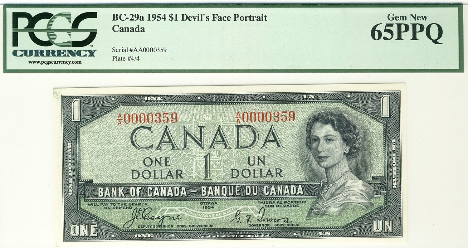 Low Serial Number 1954 $1 Bc-29a A/A0000359 PCGS UNC65PPQ Low serial number