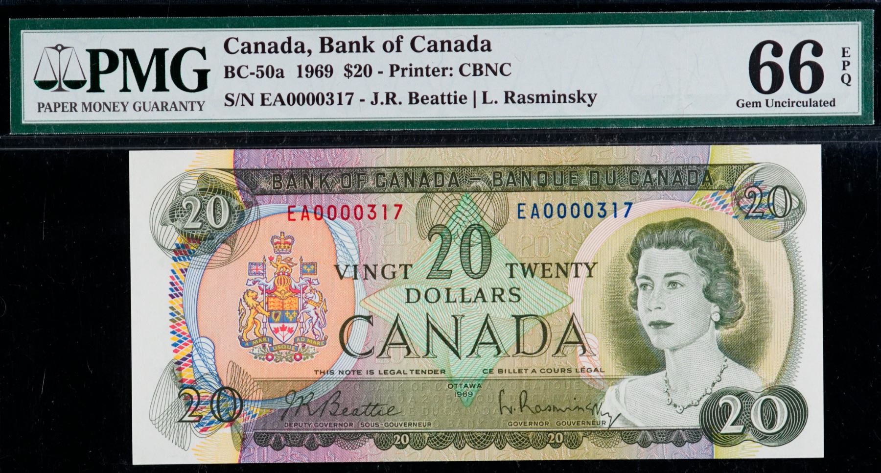 Low Serial Number; 1969 $20 BC-50a #EA0000317, PMG Superb Gem Uncirculated-66EPQ.