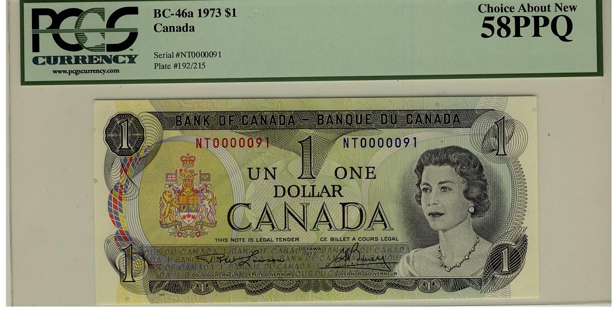 Low Serial Number 1973 $1 BC-46a NT01000091 PCGS AU58PPQ