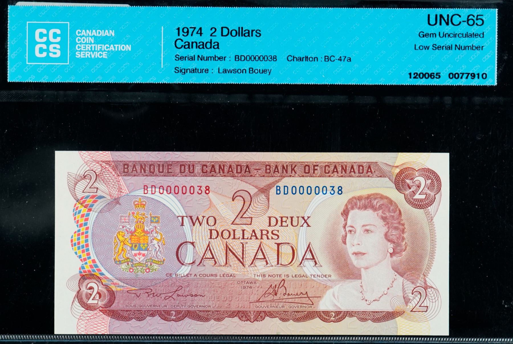 Low Serial Number; 1974 $2 BC-47a #BD0000038, CCCS Gem Uncirculated-65.