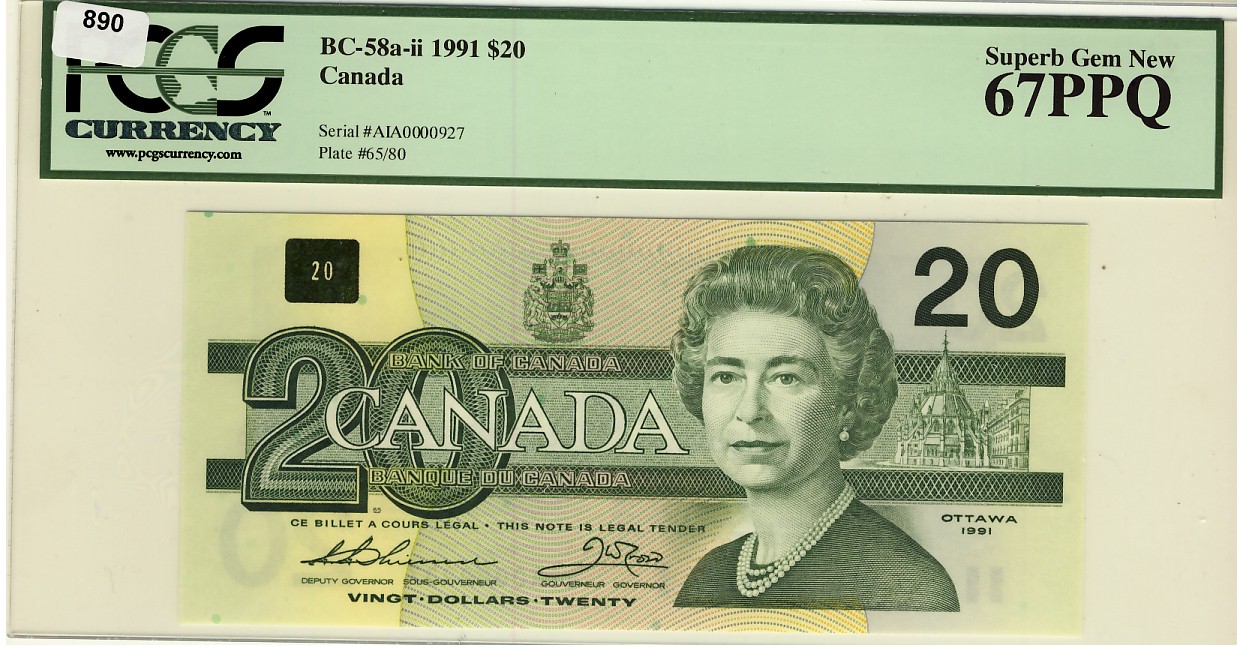Low Serial Number 1991 $20 BC-58a-ii AIA0000927 PCGS UNC67PPQ
