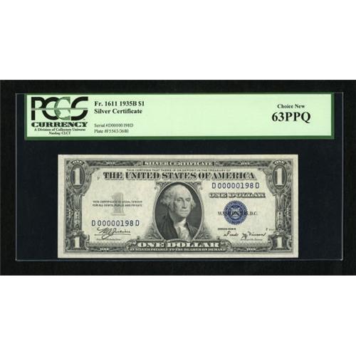 <B>Low Serial Number Fr. 1611 $1 1935B Silver Certificate. PCGS Choice New 63PPQ.</B></I><BR> Serial number D00000198D is found on this $1.<BR><BR><b>Shipping:</b> Coins & Currency (<a target="_blank" href="http://www.heritageauctions.com/common/shipping.php">view shipping information</a>)