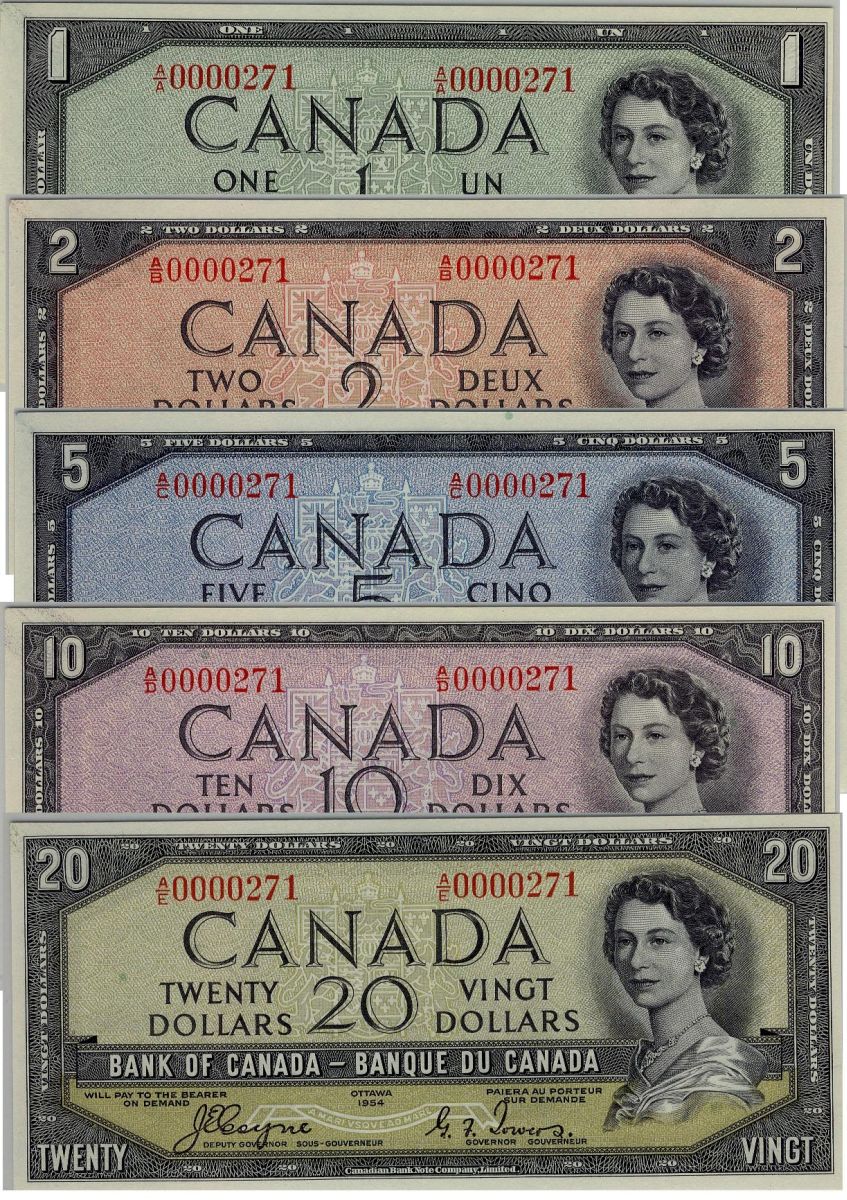 Low Serial Numbers 1954 $1 to $20 Devil's Face - Coyne -Towers Low Serial Match Set # . Includes BC-29a PMG CH UNC64, BC-30a Gem UNC66, BC-31a Gem UNC65, BC-32a Gem UNC65 & BC-33a Gem UNC66. All notes graded PMG and all EPQ.