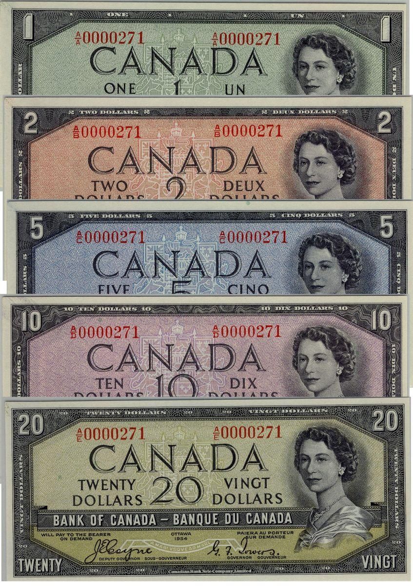 Low Serial Numbers 1954 $1 to $20 Devil's Face - Coyne -Towers Low Serial Match Set # . Includes BC-29a PMG CH UNC64, BC-30a Gem UNC66, BC-31a Gem UNC65, BC-32a Gem UNC65 & BC-33a Gem UNC66. All notes graded PMG and all EPQ.