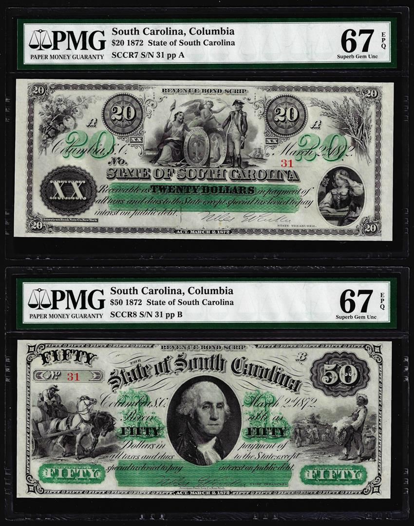 One Low Serial Set 1872 $20 & $50 South Carolina Obsolete Notes PMG Superb Gem Unc. 67EPQ. PMG Certified.