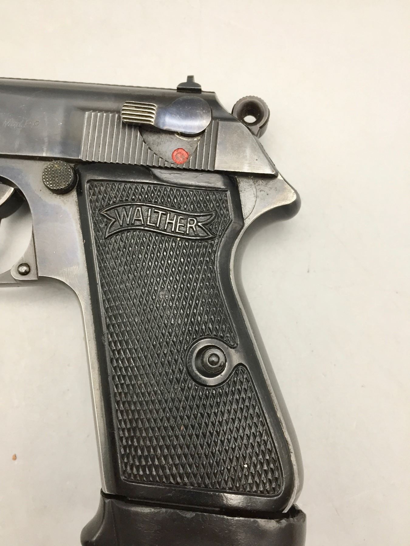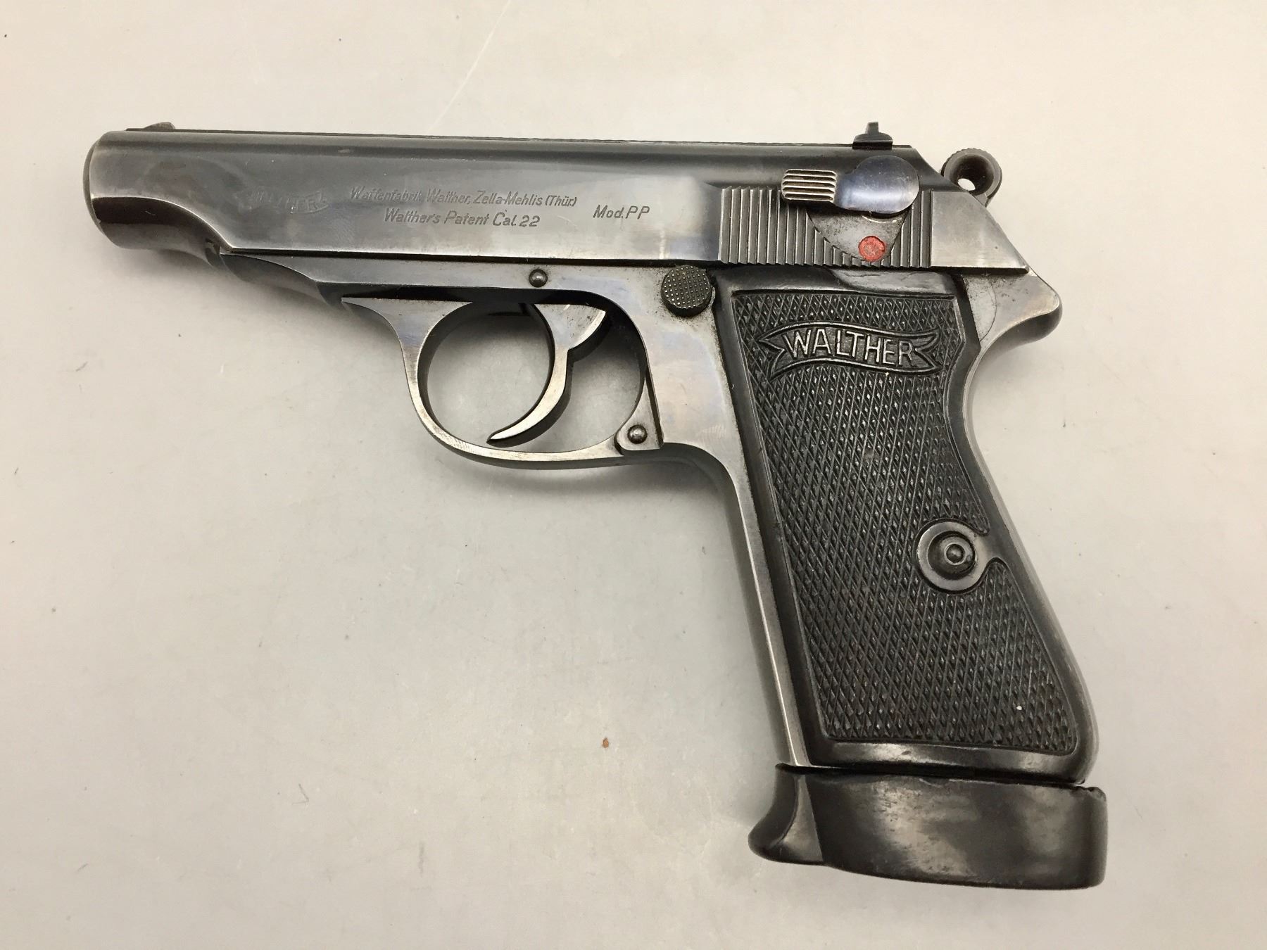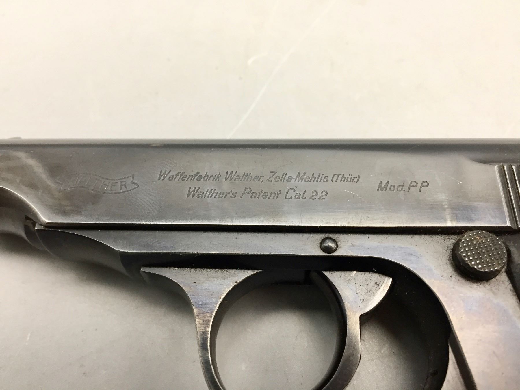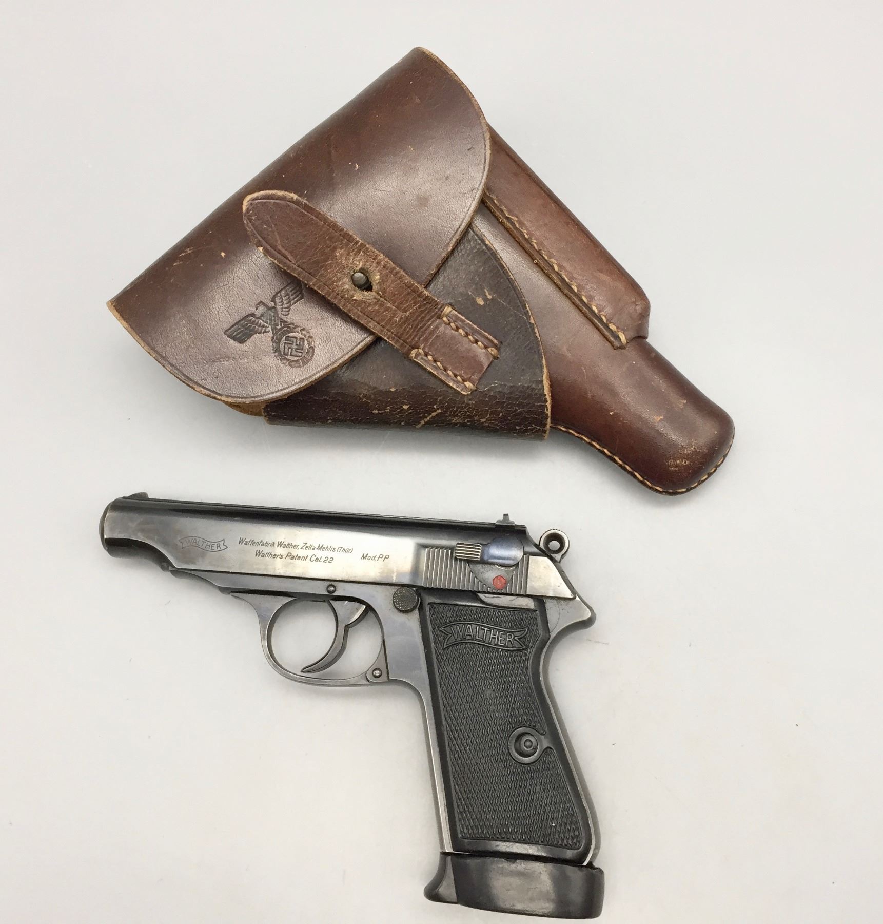 Description: Presented for sale in this lot is this Walther, PP, in a rare .22 (5.60) caliber, featuring blued steel, original grips and a German marked leather holster. This one is in very good (98% +) condition! It comes with an extra clip. The holster is marked D.R.G.M. and the German insignia underneath the flap. The holster also has a German mark on the outside of the flap which is probably not original to the piece. Maker: Walther. Approx. Age: Late 1930s based on serial # 143969. Size: Standard size for this model, but in a rare 5.60 (.22 LR) Cal.. Condition: Very good for its age, minor wear expected. Retains much of its original finish. Please look closely at the pictures - they are an important part of our description. Shipping: There will be a $10 handling / packaging fee for shipping this lot. The actual cost of postage will be added on top of that. *****This firearm requires an FFL Transfer*****