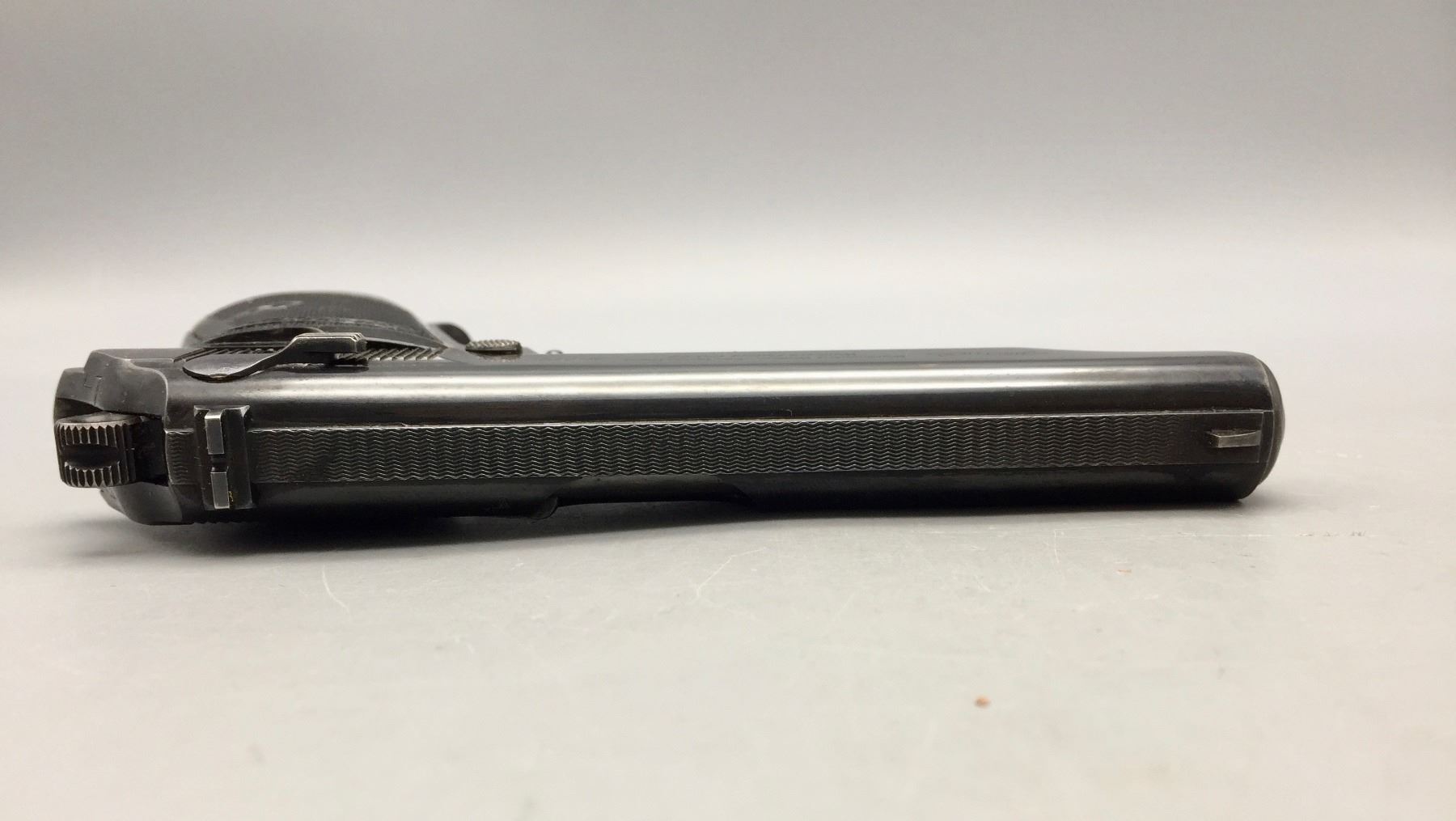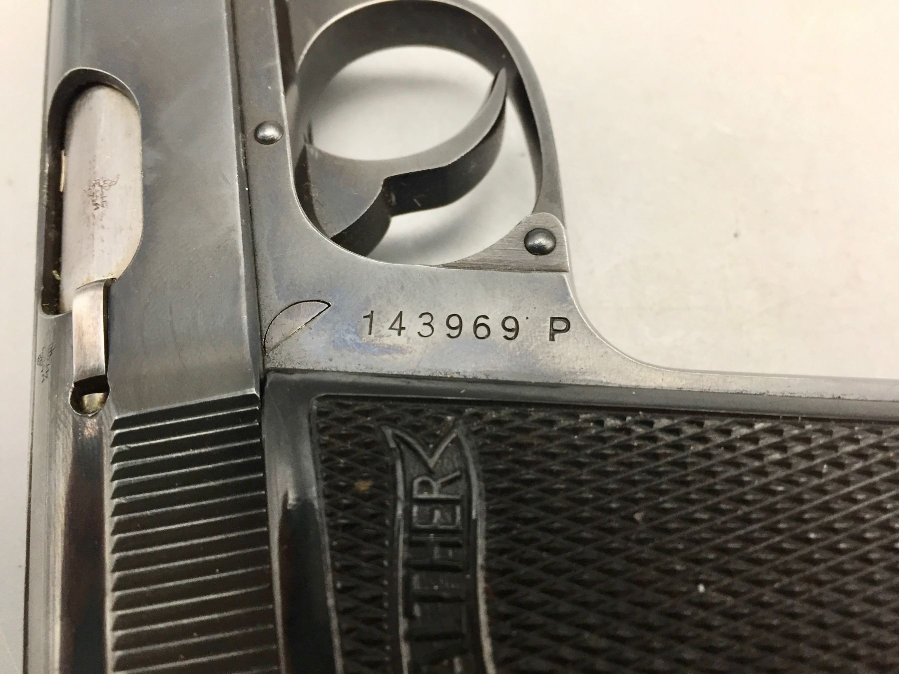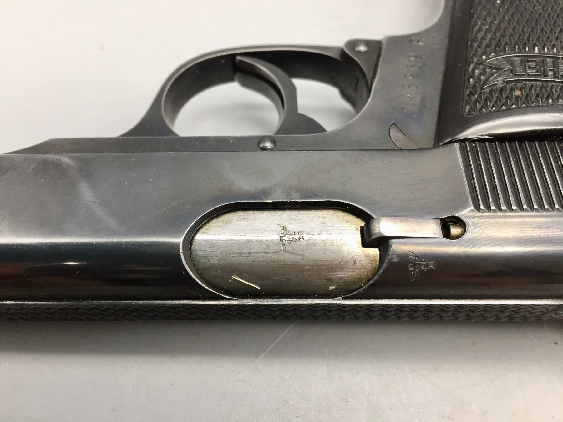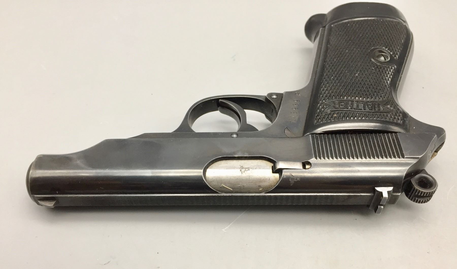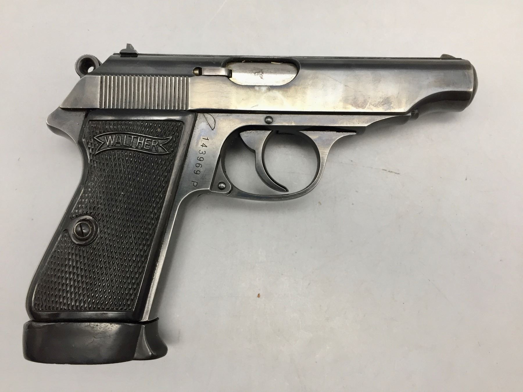 Description: Presented for sale in this lot is this Walther, PP, in a rare .22 (5.60) caliber, featuring blued steel, original grips and a German marked leather holster. This one is in very good (98% +) condition! It comes with an extra clip. The holster is marked D.R.G.M. and the German insignia underneath the flap. The holster also has a German mark on the outside of the flap which is probably not original to the piece. Maker: Walther. Approx. Age: Late 1930s based on serial # 143969. Size: Standard size for this model, but in a rare 5.60 (.22 LR) Cal.. Condition: Very good for its age, minor wear expected. Retains much of its original finish. Please look closely at the pictures - they are an important part of our description. Shipping: There will be a $10 handling / packaging fee for shipping this lot. The actual cost of postage will be added on top of that. *****This firearm requires an FFL Transfer*****