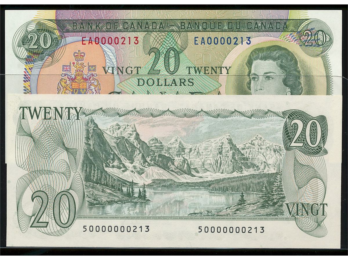 Low Serial number; 1969 $20 BC-50a & 1979 $20 BC-54a #0000213. Lot of 2 notes both AU to UNC.