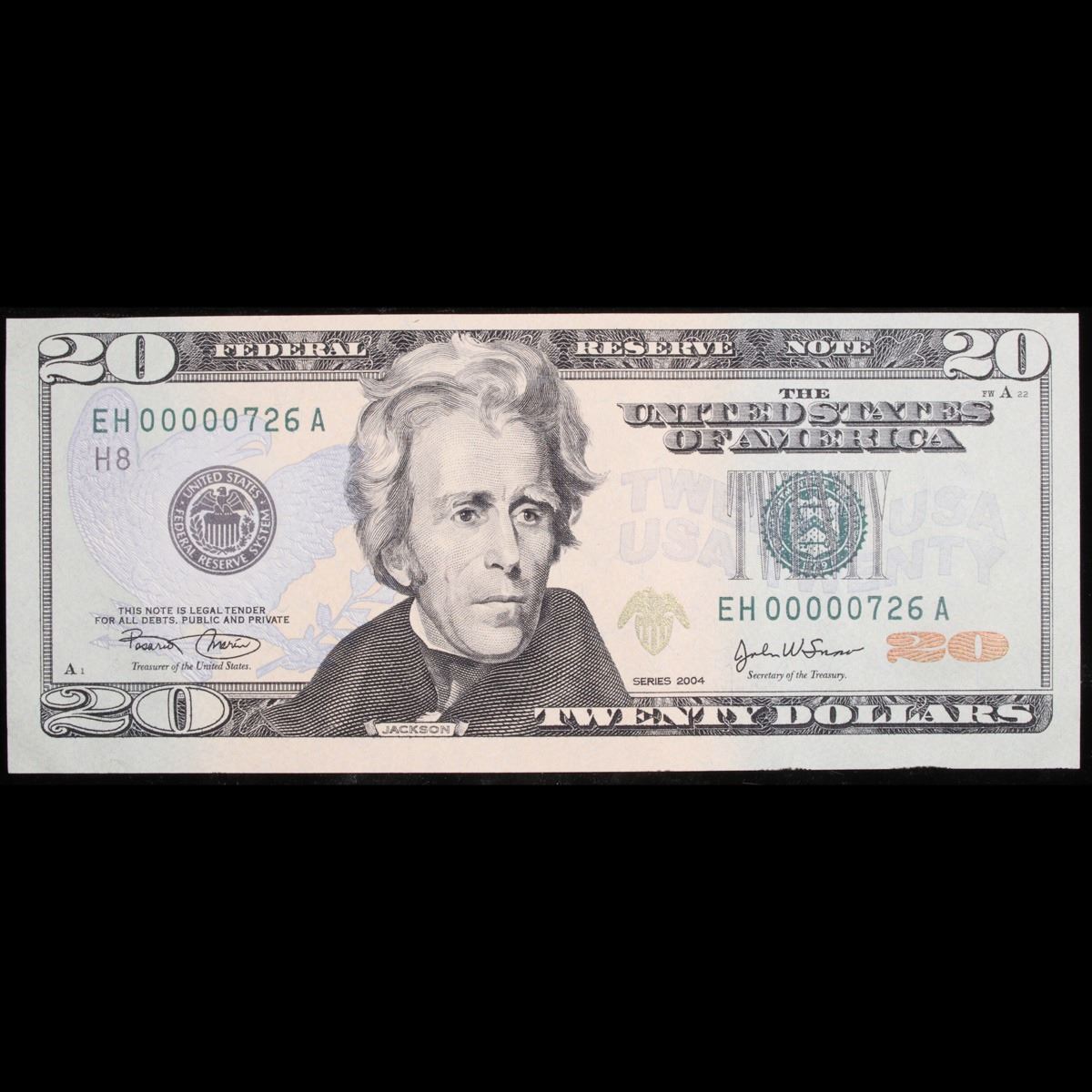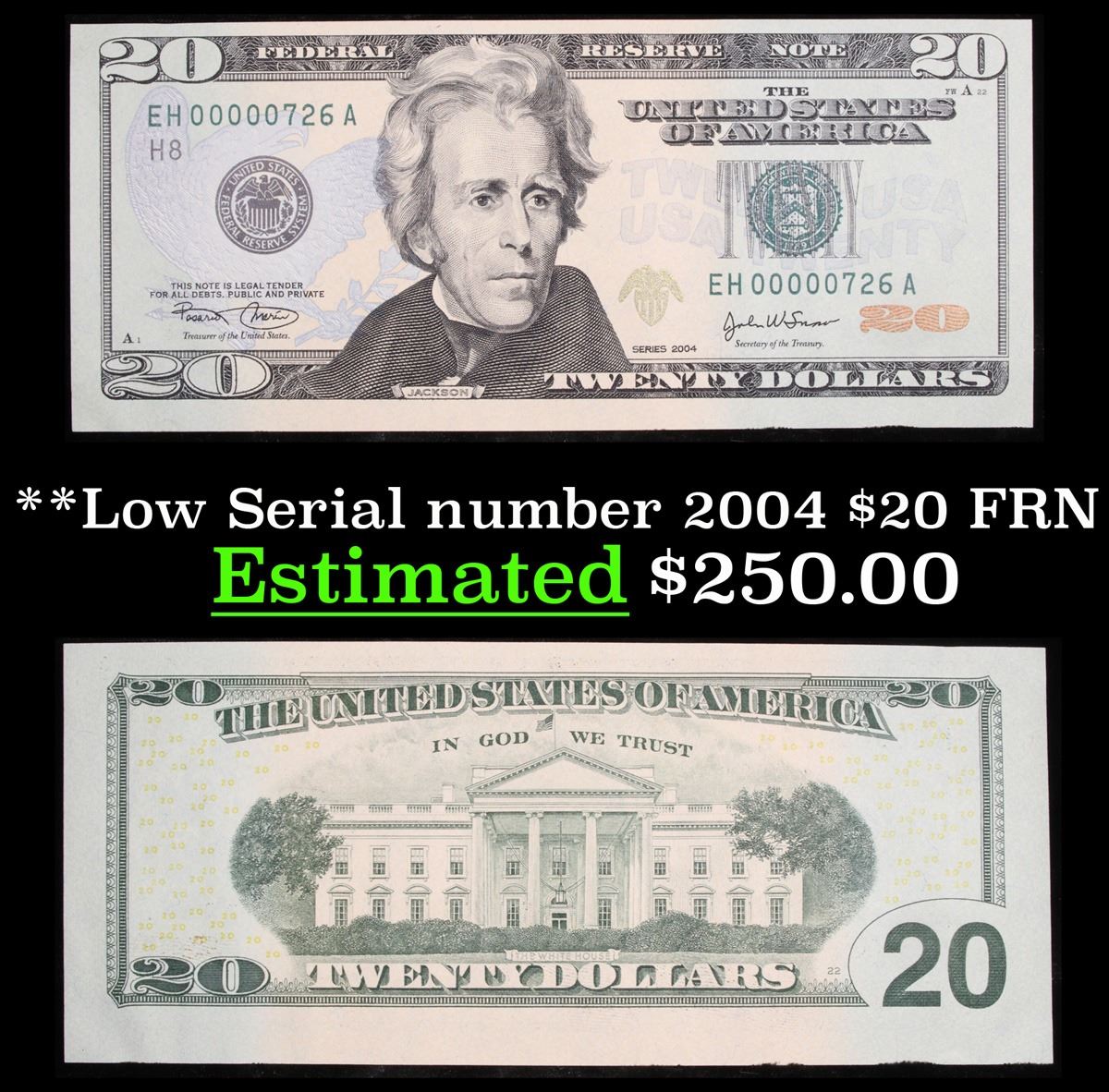 **Low Serial number 2004 $20 FRN Grades. Hard to find low serial number note. This is a 2004 $20 Federal Reserve Note with serial number 726. Rare and sought after.