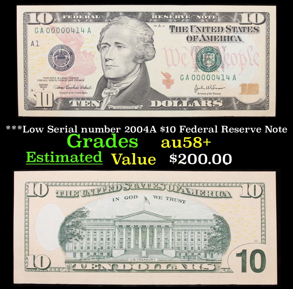 ***Low Serial number 2004A $10 Federal Reserve Note Grades. Hard to find low serial number note. This is a 2004A $10 Federal Reserve Note with serial number 414. Rare and sought after.