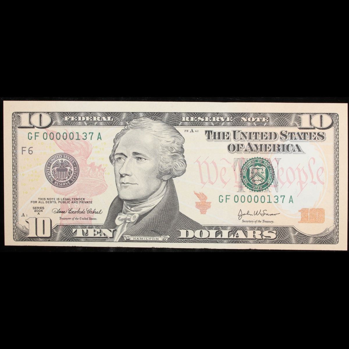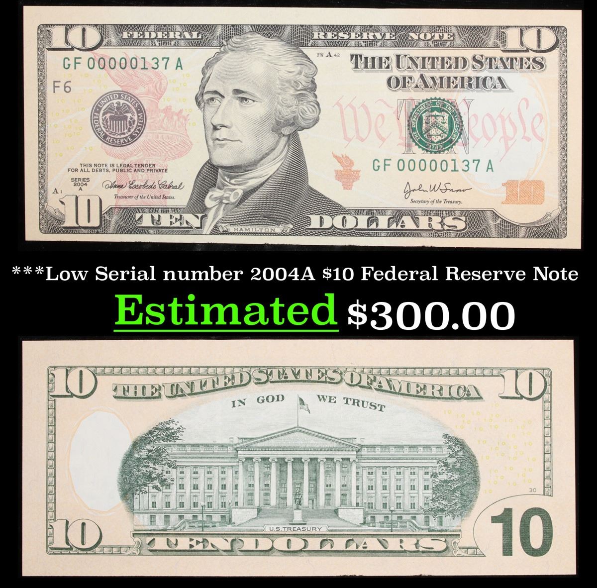 ***Low Serial number 2004A $10 Federal Reserve Note Grades. Hard to find low serial number note. This is a 2004A $10 Federal Reserve Note with serial number 137. Rare and sought after.