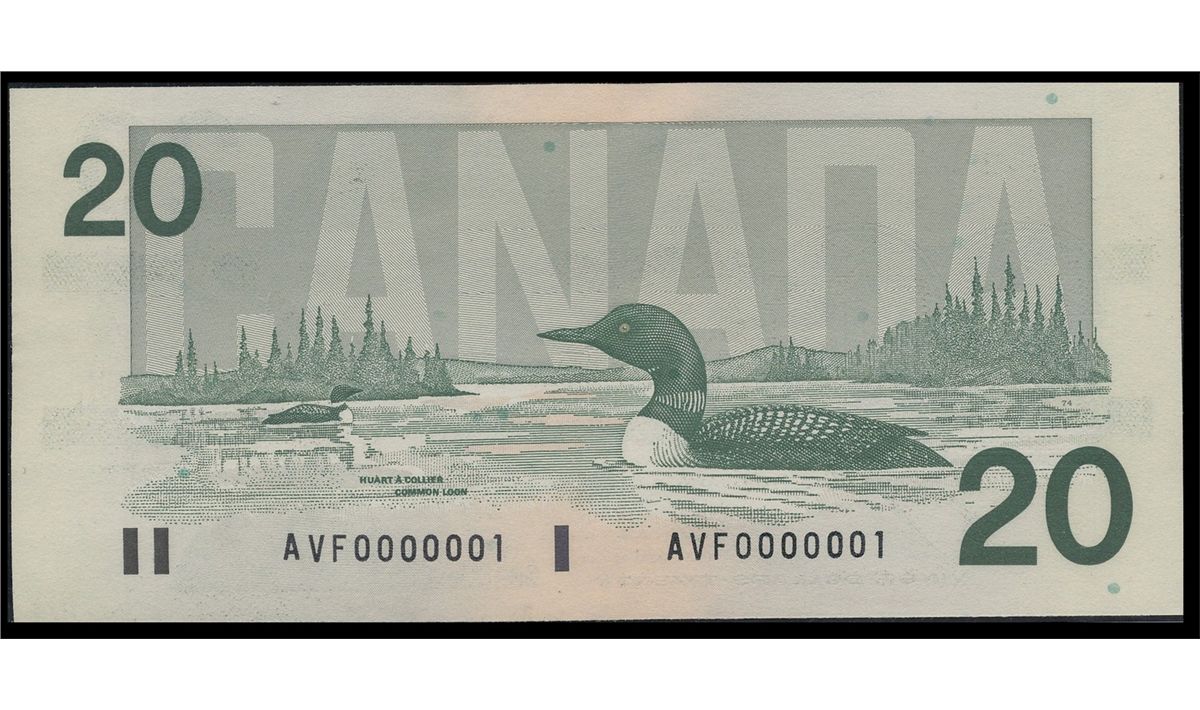 Low serial; 1991 $20 BC-58b #AVF0000001, Rare #1 issue note, PMG CH UNC64.