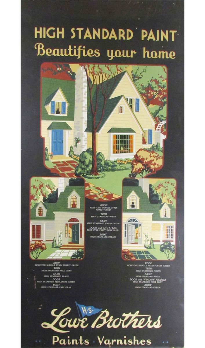 Lowe Brothers Paints and Varnishes Cardboard Sign. A few scuffs and edge wear otherwise very good condition. 18 1/2 X 38 1/2 inches.