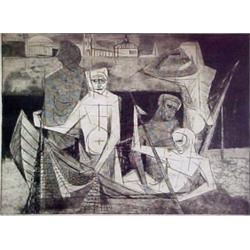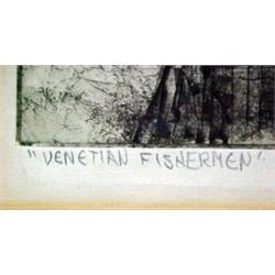 Lowell B. Nesbitt, framed engraving "Venetian Fishermen" pencil signed (lower right), listed American artist, image measures 11 1/4" x 15 3/4", slight discoloration spots on lower figure Estimate 100/200