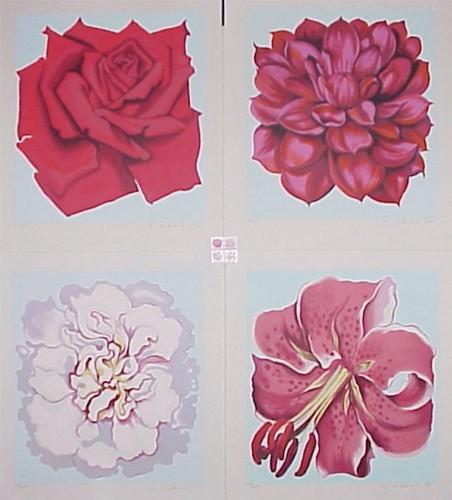 FLOWERS, 1981, suite of four color screenprints, each signed in pencil, from the numbered edition 250, images 20 x 18”, with US Postal stamps of the images. $400/600