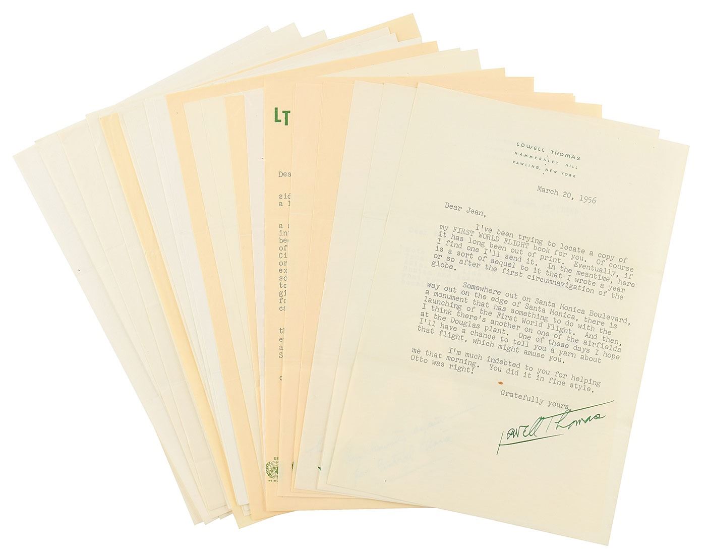 Archive of 25 typed letters from writer and broadcaster Lowell Thomas, each signed either "L. T.," "Lowell," or "Lowell Thomas," dated between 1956 and 1976, each addressed to Barbara Jean Sewell. In overall fine condition. Accompanied by seven original mailing envelopes, and a typed letter from Thomas to Arnold W. Lawrence, with handwritten notations to second page.