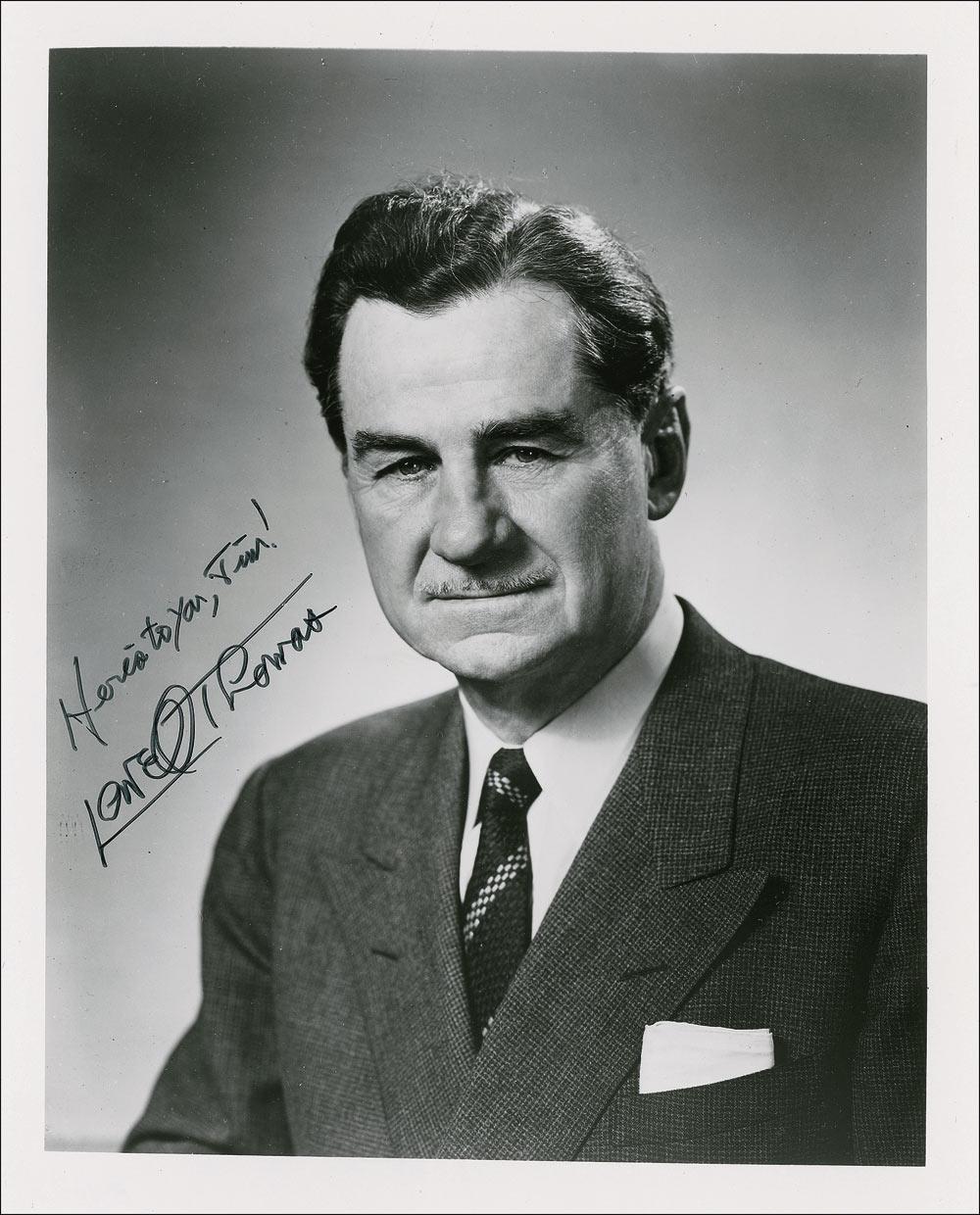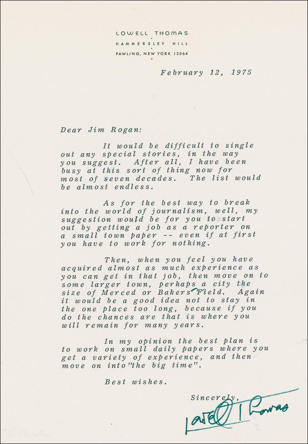 American author, journalist, and traveler (1892–1981). Two items: TLS, one page, 7.25 x 10.5, personal letterhead, February 12, 1975. Thomas writes to an aspiring journalist. In part: “As for the best way to break into the world of journalism, well, my suggestion would be for you to start out getting a job as a reporter on a small town paper—even if at first you have to work for nothing.”; and a glossy 8 x 10 photo of Thomas, signed and inscribed in black felt tip, “Here’s to you Jim! Lowell Thomas.” In fine condition, with some scattered light creases to left side of photo. RRAuction COA.