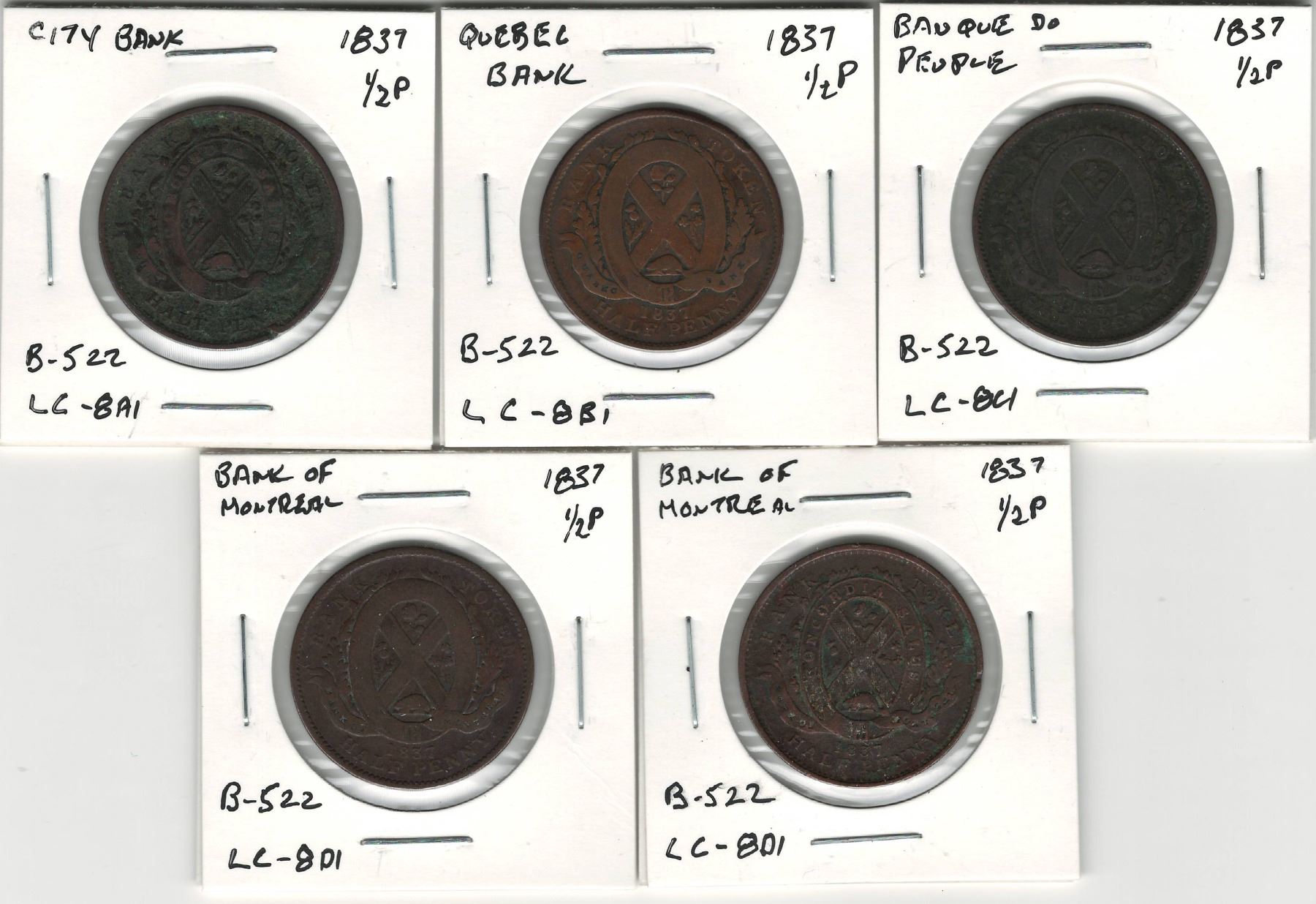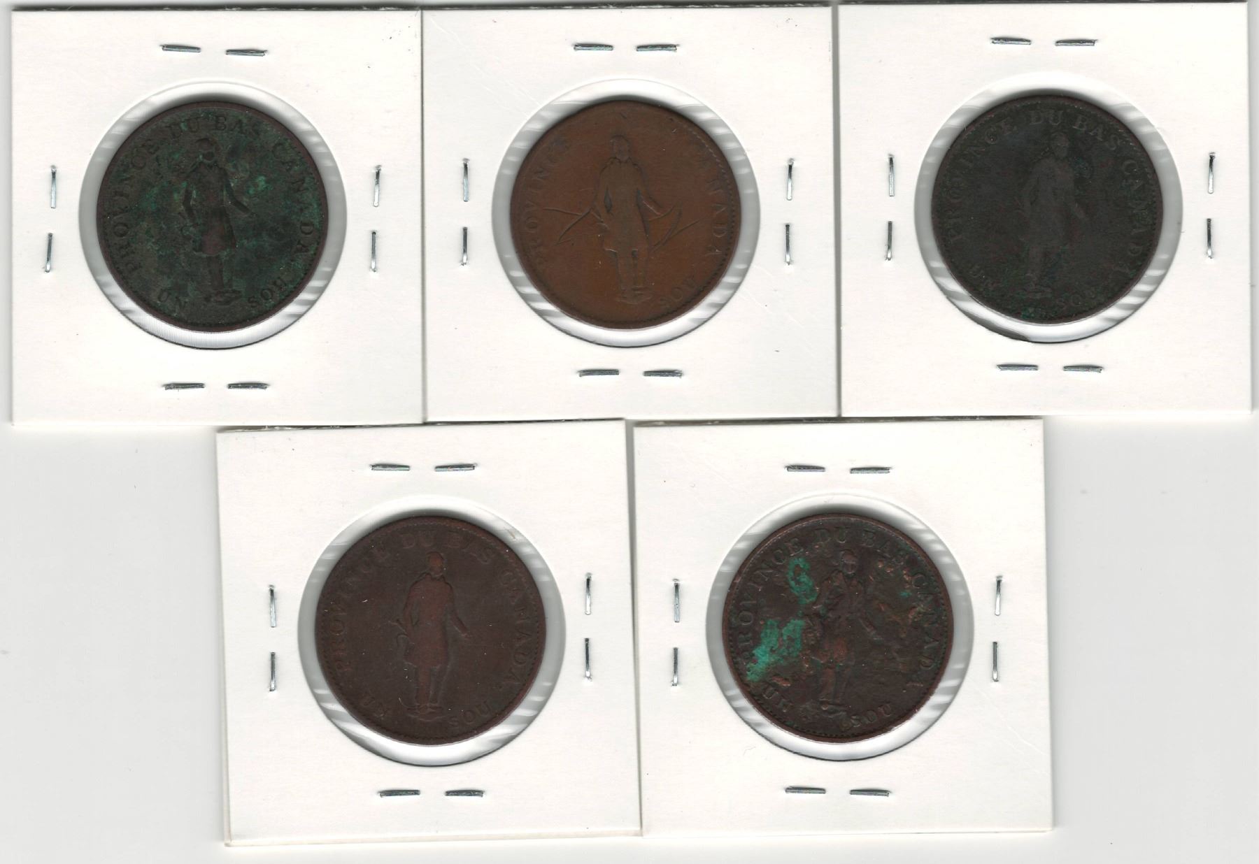 Lower Canada 1/2 Penny Token Lot. LC-8A1, LC-8B1, LC-8C1, LC-8D1 (2). Circulated. (5 pcs)