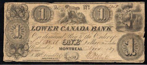 Lower Canada Bank CH-415-10-02 $1 1837 Nov 4, Montreal Signed White No.1453. Fine for issue. Charlton catalogue page 226 mentions that NO KNOWN ISSUED NOTE. Forever, a rare item!