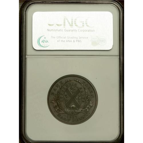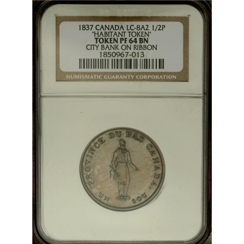<B>Lower Canada Half Penny Token 1837, </B></I>LC-8A2, Proof 64 Brown NGC, City Bank on ribbon.<BR><BR><b>Shipping:</b> Coin/Currency (<a target="_blank" href="http://www.heritageauctions.com/common/shipping.php">view shipping information</a>)