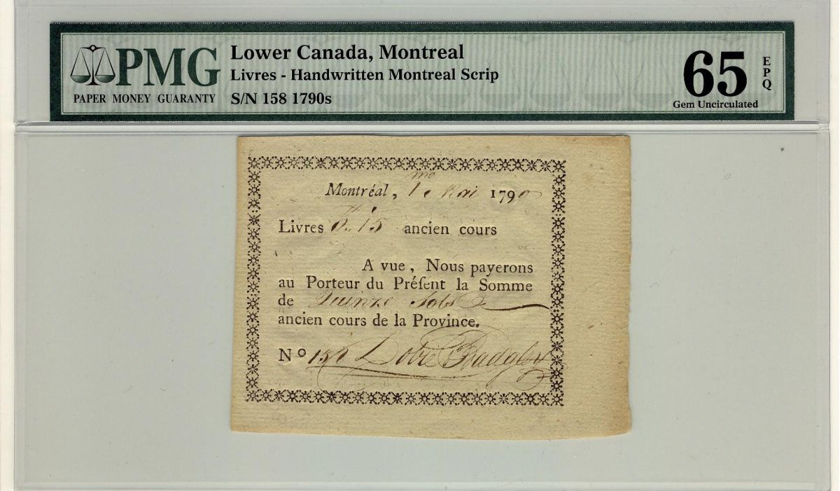 Lower Canada, Montreal, 1790 0,15 Livres #158, PMG UNC65EPQ. Simply a splendid example.