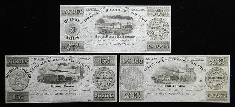 Lower Canada, Montreal. Champlain & St. Lawrence Railroad. 7 1/2d, 15d and 2 Shillings 6d, unissued 3 note set, 1/8/1837. Popular train vignettes with Spanish 1, 2 and 4 Reales coin images. All handsome CU. Nice set of coin notes. 3 notes.