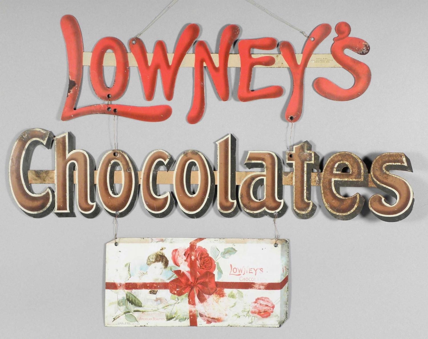 Lowney's Chocolates Die Cut Three Piece Tin Sign. Chain Sign Registered U.S. Patent Office March 24, 1908, Kaufmann & Strauss Lithographers, NY. Some rust and fading otherwise good condition. 17 1/2 X 13 inches.
