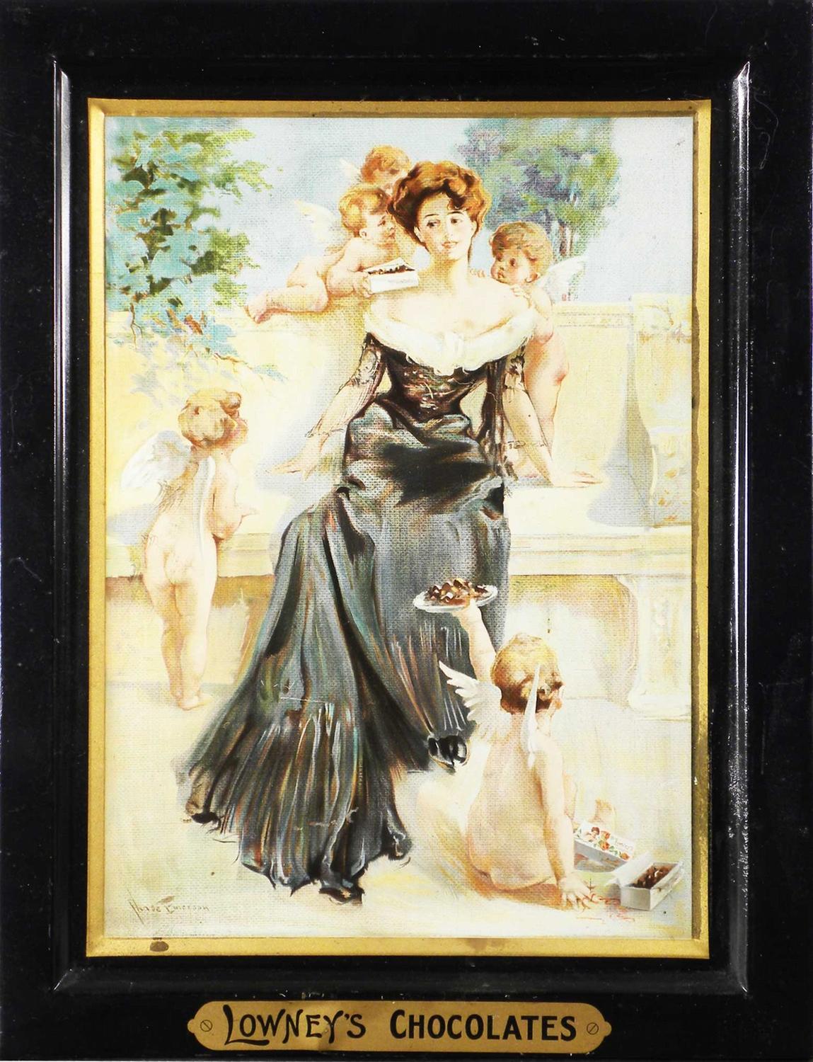 Lowney's Chocolates Self Framed Tin Sign. Silk screened image of woman with cherubs by artist Chase Emerson. Some restoration to frame otherwise excellent condition. 15 1/4 X 19 1/4 inches.