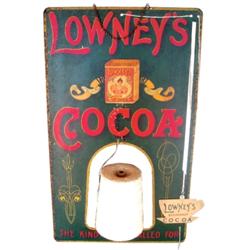 Lowney's Cocoa string holder, double-sided litho on die cut tin-HD Beach, 1908, Good condition, replacement cup, 14"W x 24"H.
