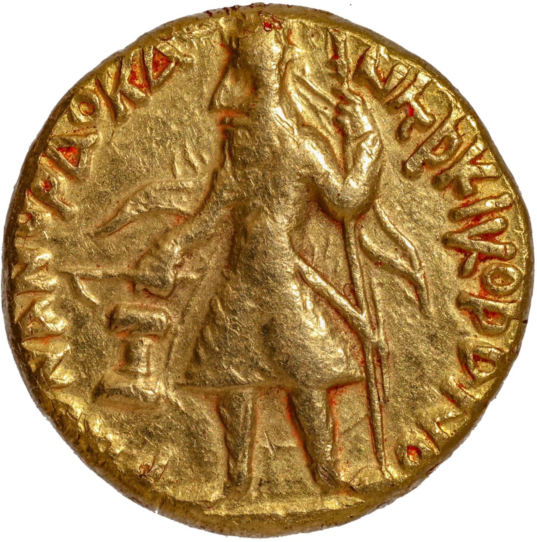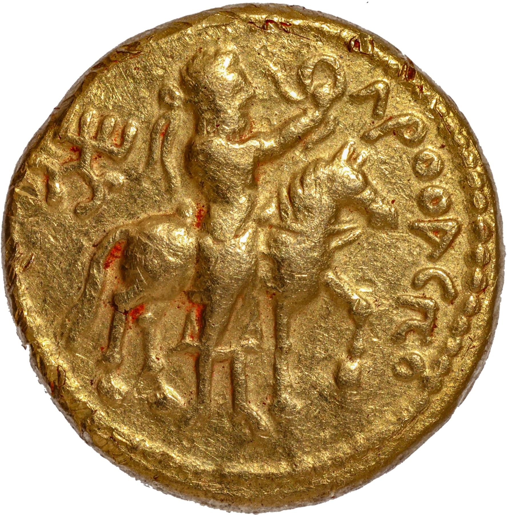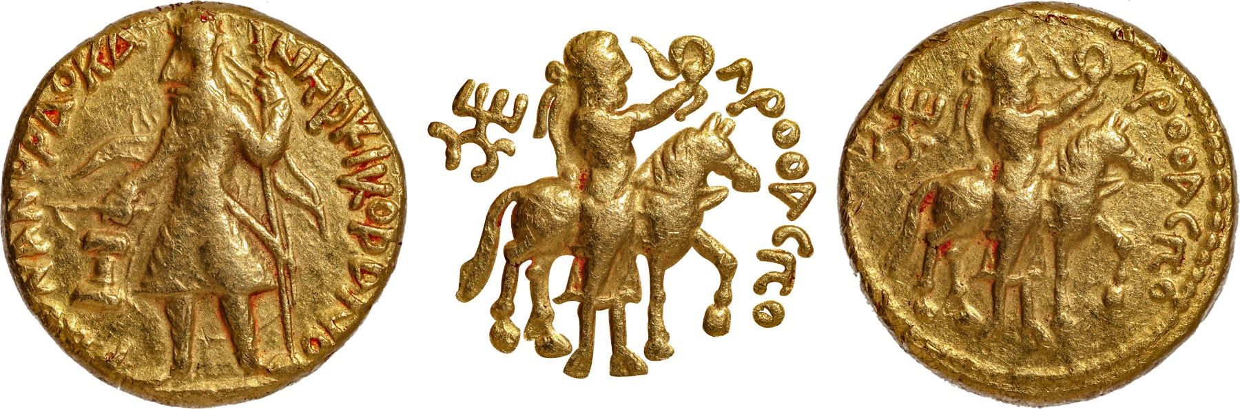 Kushan Dynasty, Kanishka I (127-140 CE), Gold Dinar, “Lrooaspo (Drvaspa)” type, Main Mint in Bactria (Balkh?), Late phase, Obv: the diademed king standing facing the left, holding a spear in his left hand and sacrificing over an altar on the left field, with flames on his right shoulder, the Bactrian legend "ÞAONANOÞAO KA-NHÞKI KOÞANO" "Shaonashao Kanishki Koshano" (King of Kings, Kanishka the Kushan) around the field, Rev: God Drvaspa, diademed and bearded, standing facing the right, holding a diadem in the right hand, a caparisoned horse behind, standing right with left foreleg raised,  a tamgha in the right field, the Bactrian legend “ΛPOOACΠO” in the right field, a dotted border around the field, 7.3g, 18.25mm, (Gobl # 57/Variant of Shrava # 128), good quality overall, about very fine, Exceptionally Rare.