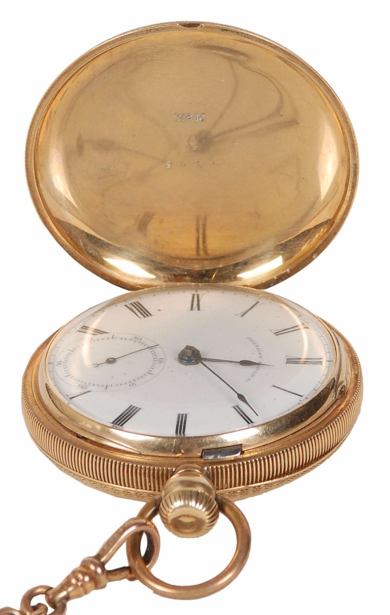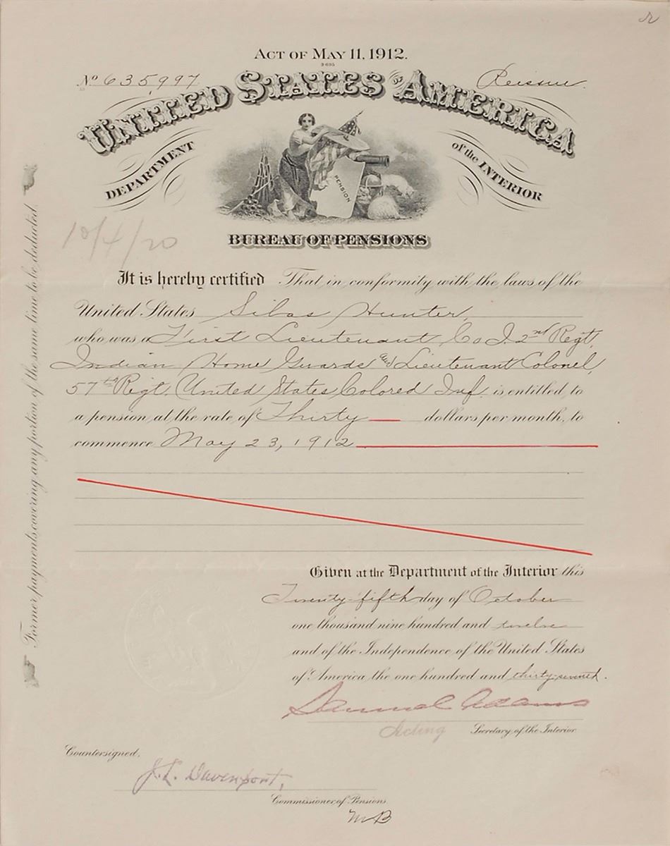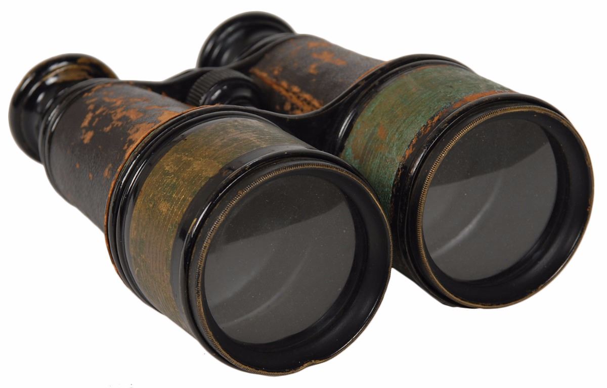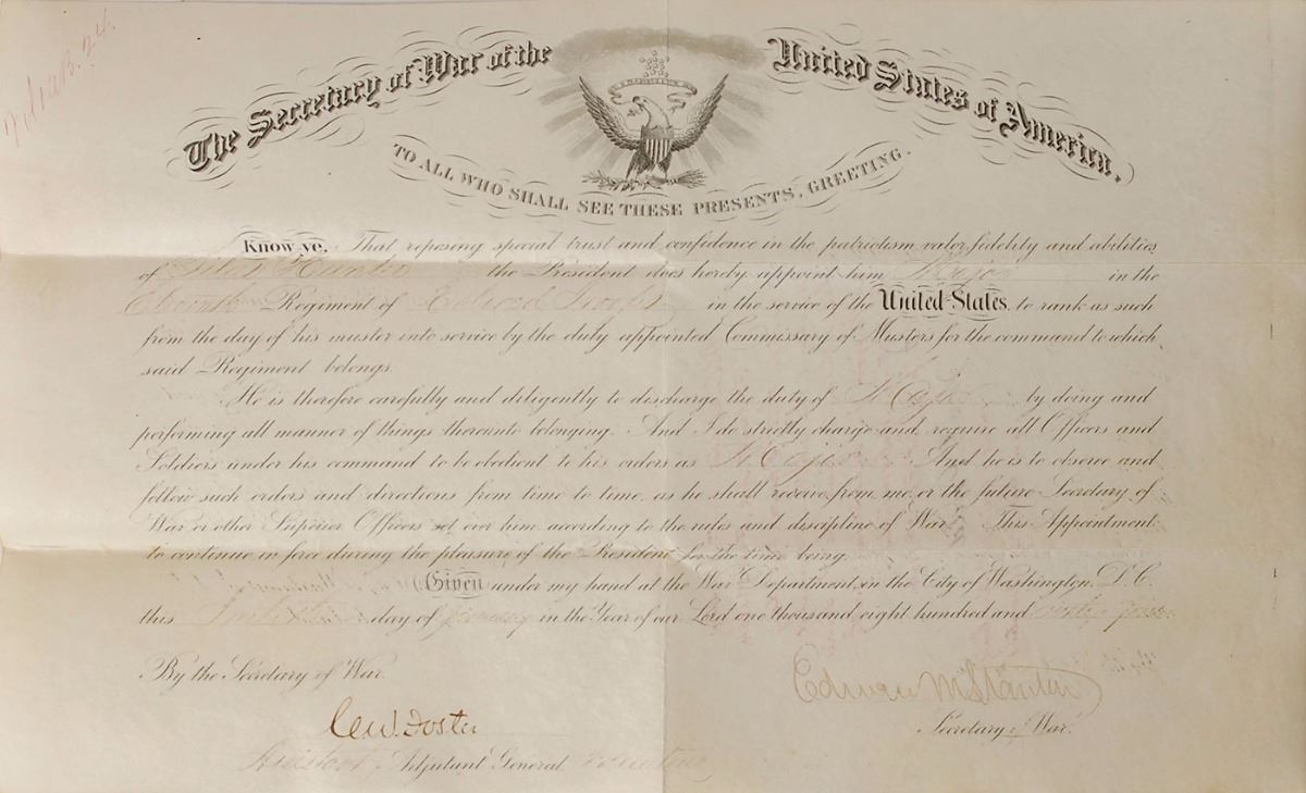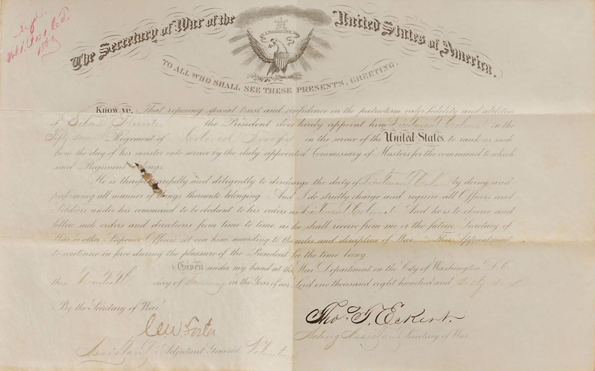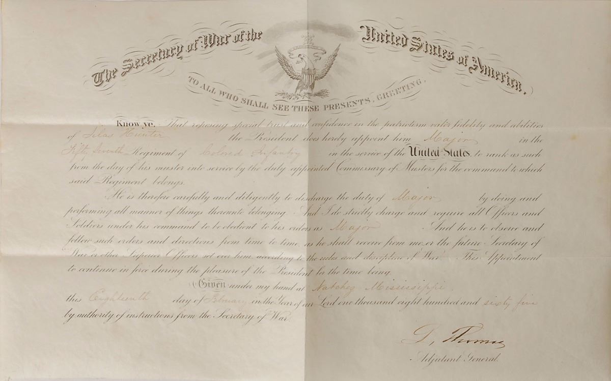 Impressive collection of items identified to Lt. Col. Silas Hunter, who served in the 2nd Indiana Home Guard, the 11th US Colored Troops, and the 57th US Colored Troops, including: a beautiful presentation key-wound pocket watch by American Watch Co. in a golden case, engraved on the outside with his initials, “SH,” and engraved inside, “Presented to Lt. Col. S. Hunter by the Line Officers of his Reg. as a token of their esteem, Dec. 6th 1866”; Hunter’s field glasses marked “Merchant Marine, Paris” on the eyepieces, with a leather-wrapped body; four original documents including military commissions signed by Edwin M. Stanton and Lorenzo Thomas; and an impressive circa 1870s print of a charcoal portrait of Hunter presented in its 23 x 28 period frame. In overall very good to fine condition. Accompanied by several newspaper clippings related to Hunter. A desirable collection from a senior officer of the US Colored Troops.