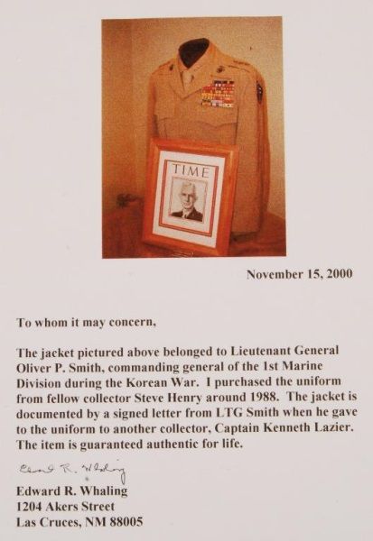 Lt. General Oliver P. Smith. (1893-1977) This summer service jacket complete with rank, insignia and ribbons is undoubtedly one of the most important uniforms in the Profota Collection. Comes with a letter from General Smith about this uniform.