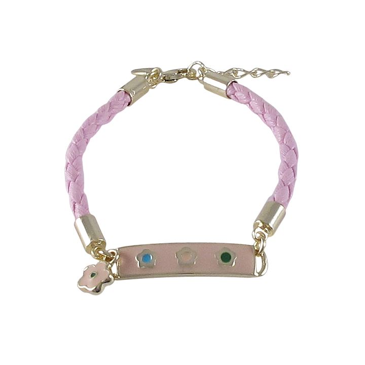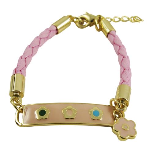 Lt. Pink Enamel Bar With Multi Color Flowers Pink Cord Bracelet Brass