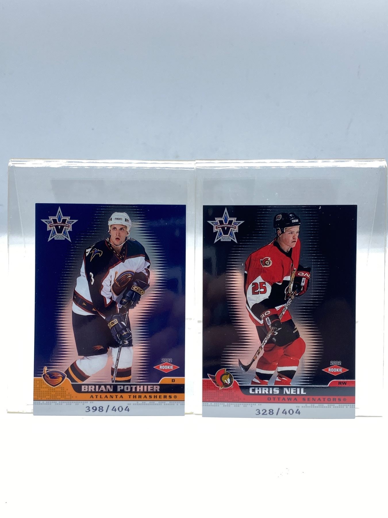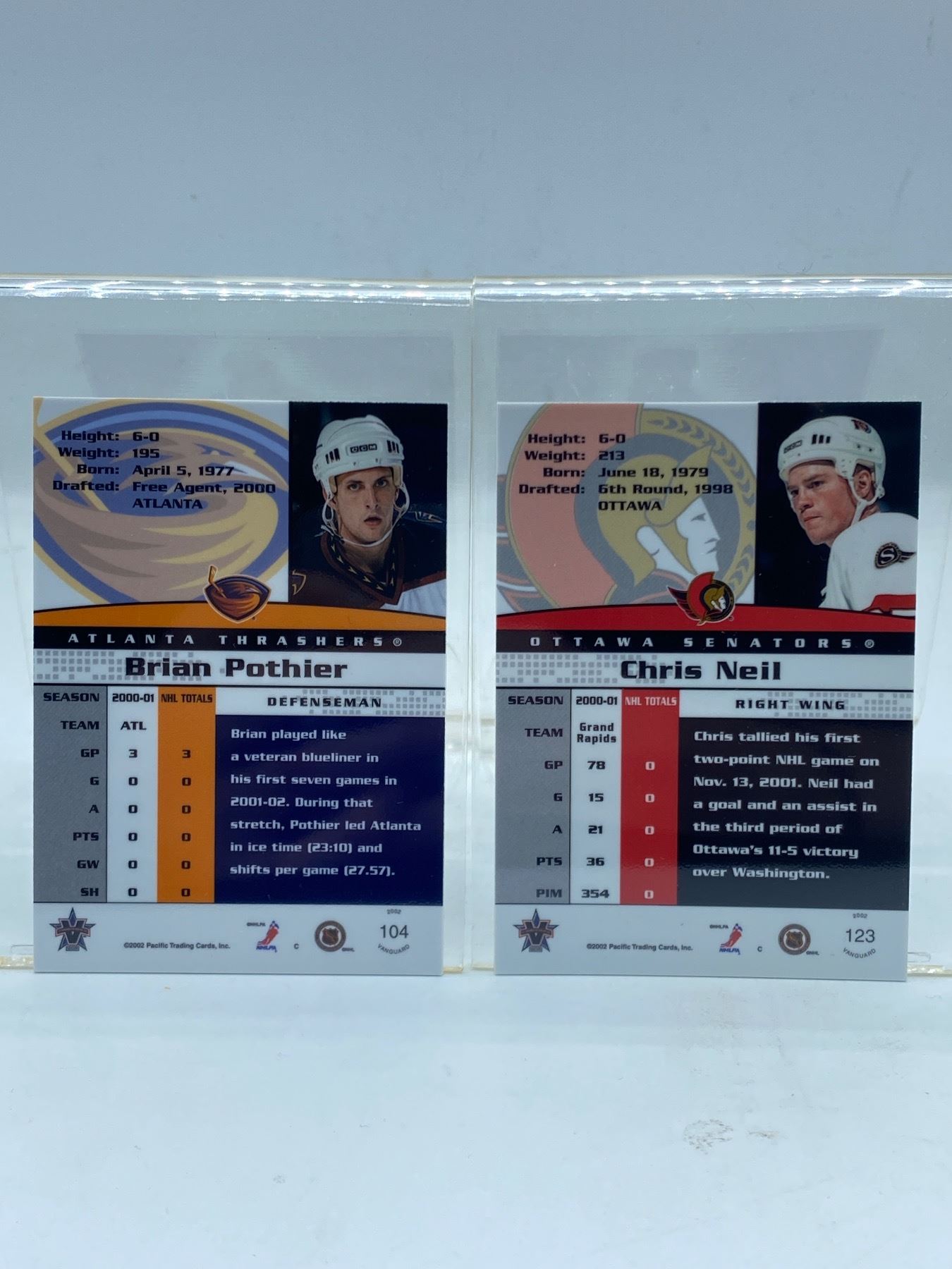 Ltd Ed, 2002 Pacific Trading Rookies Chris Neil 328/404 & Brian Pothier 398/404 Rookie Cards #123 &104