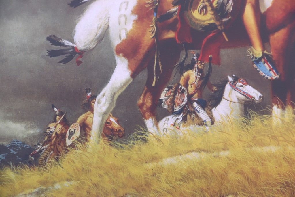 Offered in this lot is a limited edition, framed presentation of Frank McCarthy's “When the Land Was Theirs”, with a display of Arizona Mined Turquoise. The print is framed and matted with a tag on the bottom. Inset into the matting is a plastic round disk of turquoise from the renowned, and now closed, "Sleeping Beauty" mine in Globe, Arizona. This display was made and authenticated by Bradford Exchange. This piece is numbered 38 of 2500. The piece is in good condition, showing a minor surface mark on the cover glass. The shown art measures 11" x 10 1/2"; the disk of turquoise is 1 1/2" across and the frame is 15" x 19".