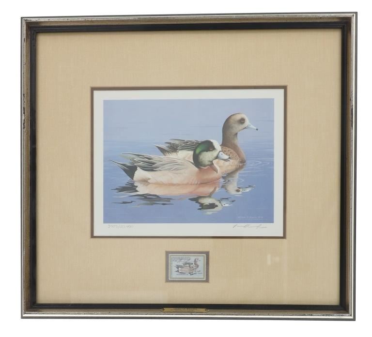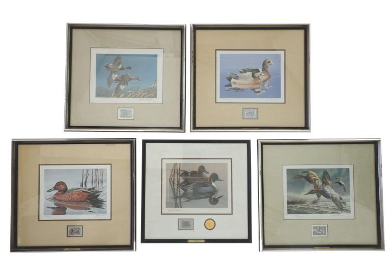 For your consideration are Five (5) Limited Edition Signed Federal Waterfowl Stamp Prints, framed, with the respective Federal Duck Stamps: Richard Plasschaert, Mallards 1980, 3332/12950, includes additional signed stamp attached to rear of frame; David A. Maass, Canvasbacks 1982, 1196/22250; Phil Scholer, Pintails 1983, Gold Medallion, 140/6700; William C. Morris, American Widgeons 1984, 50th Anniversary, 3403/20400; Gerald Mobley, Cinnamon Teal 1985, 3403/18200. The Federal Duck Stamp, formally known as the Migratory Bird Hunting and Conservation Stamp, is an adhesive stamp issued by the United States federal government that must be purchased prior to hunting for migratory waterfowl such as ducks and geese. It is also used to gain entrance to National Wildlife Refuges that normally charge for admission. The stamps are widely seen as collectables and a means to raise funds for wetland conservation. Each print and stamp set comes with the print original cream-coloured protective envelope sleeve with the artist's stylized signature on the cover, the inside which has a written explanation of the stamp, the artist, and the print. All pieces are beautiful and must-haves for stamp collectors. Professionally mounted in matted wood frames, slight scuffing to frame edges observed. Visible art measures 7.5"W x 10"L each, frames 16"W x 17"L x 1.25"D approximately. Collective weight 14lb, 10oz.
