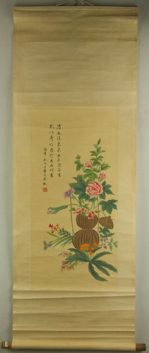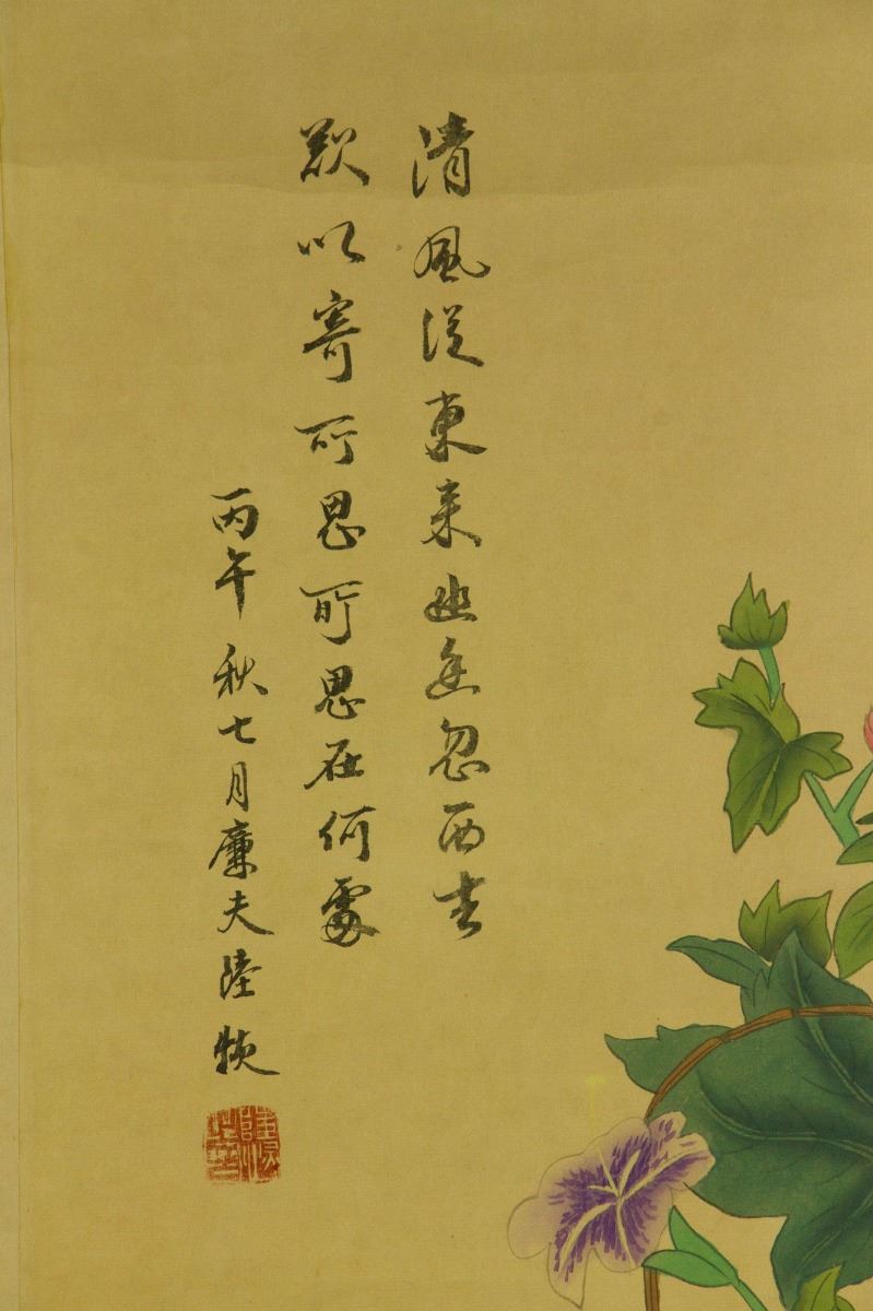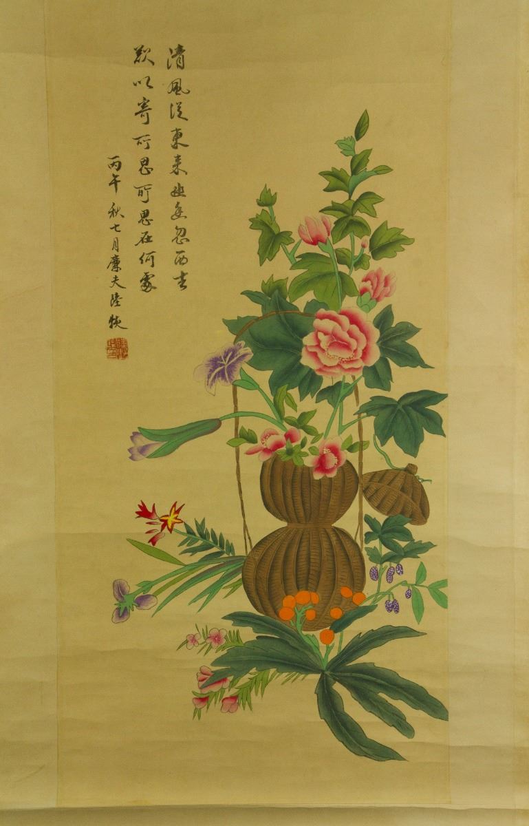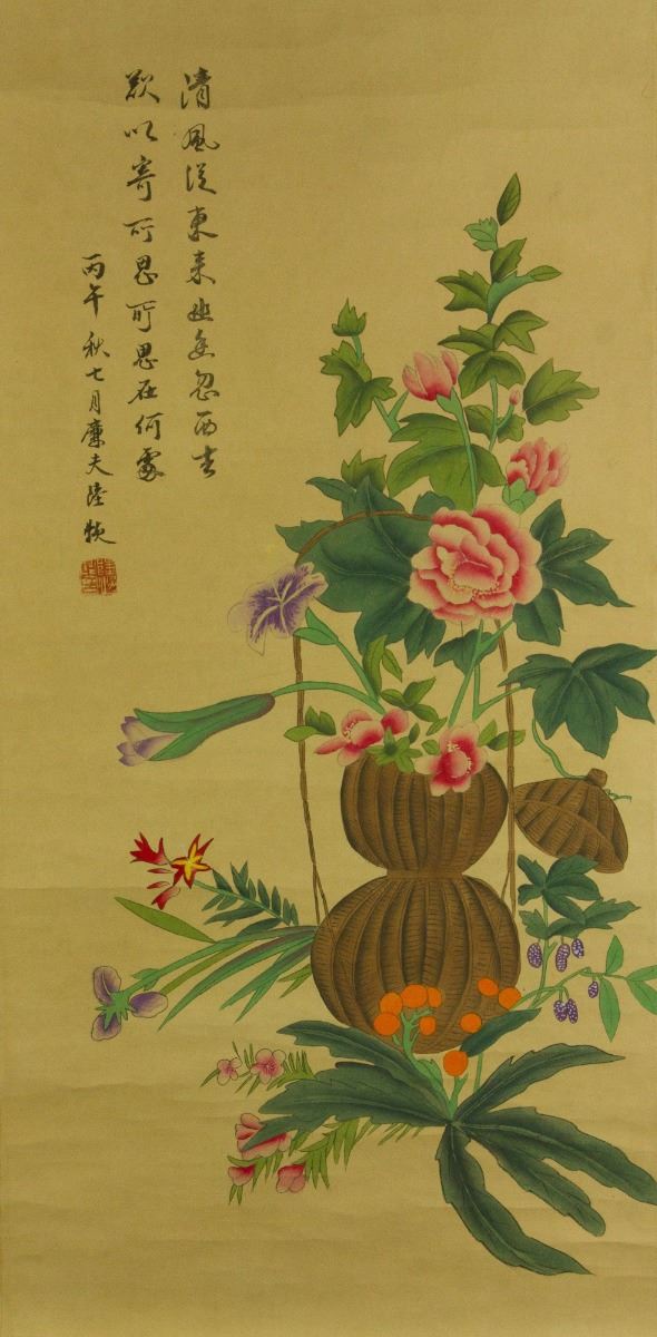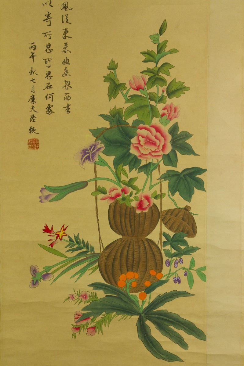 A basket of peony, morning glory and holly; Chinese ink and watercolour on paper; hanging scroll; signed Lu Lianfu (1851-1920); inscribed with one artist seal; 87 cm × 41 cm
