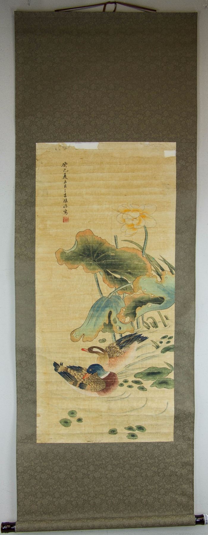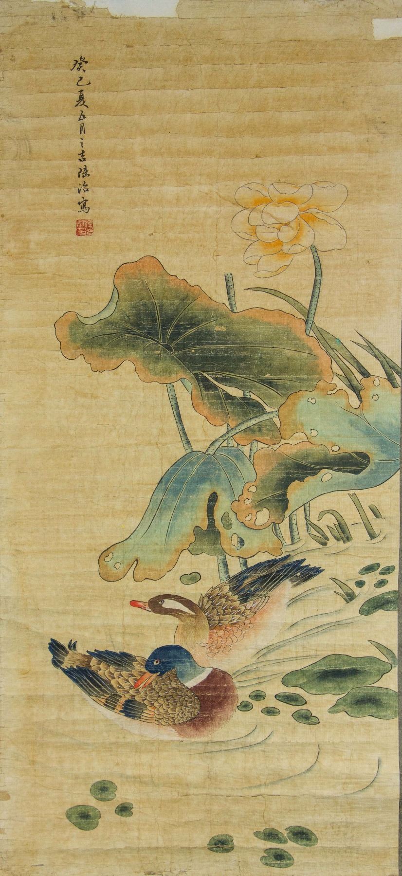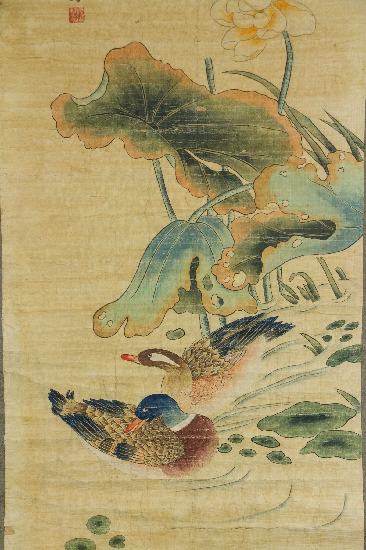 Ducks playing in the pond with lotus flower; Chinese ink and watercolour on paper, hanging scorll; signed Lu Zhi (1496-1576); inscribed with one artist seal; 160 cm × 60 cm