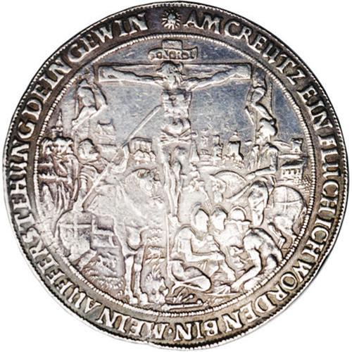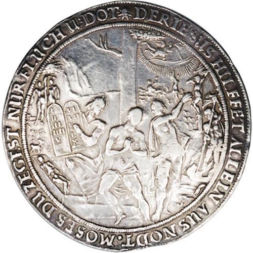 <B>Lubeck. Broad 1-1/2 Religious Schautaler ND (ca. 1619-44),</B></I> Moses, John and the fall of Man from the Grace of God/The Crucifixion of Christ, Behrens-732, as Gopel-Plum 1132, 41.99 gm, VF with tooling in the fields.
