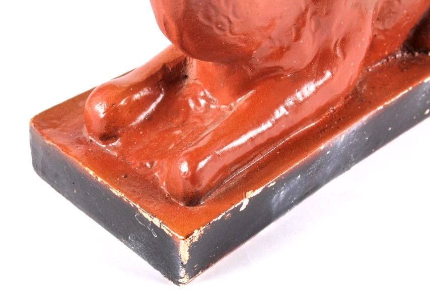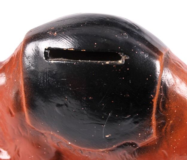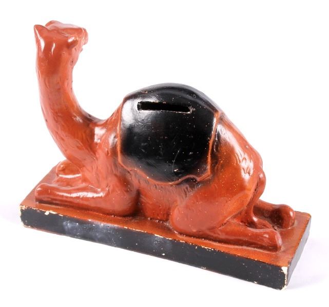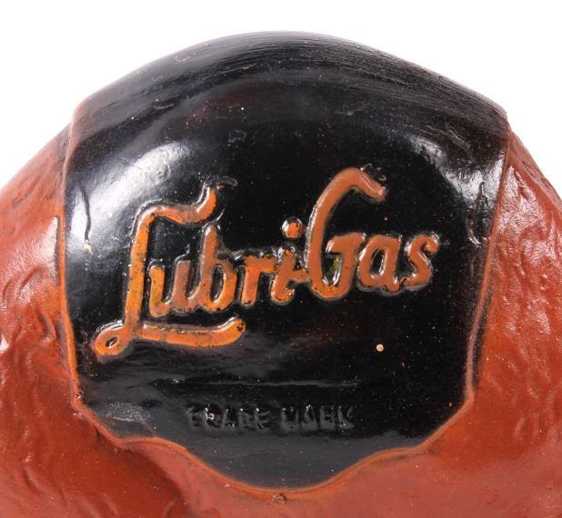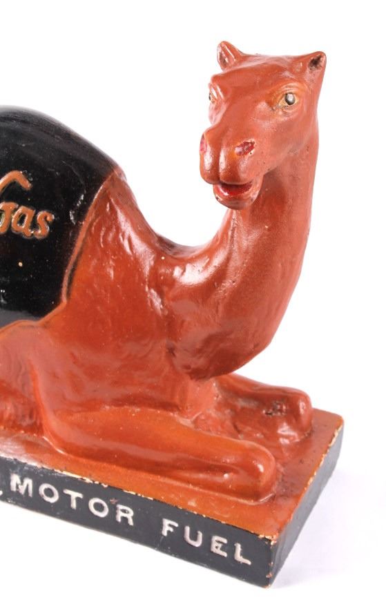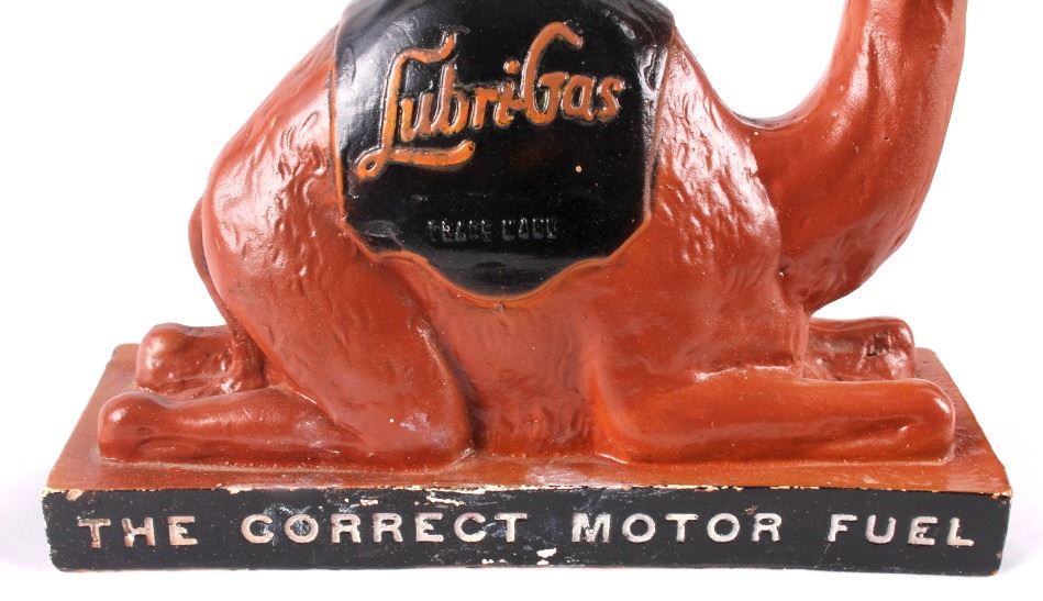 This is a Lubri-Gas camel advertising bank. The bank is the sitting camel and reads "The Correct Motor Fuel". The bank is made from chalkware and is in good condition with only minor wear. The bank measures 2.5" x 7.5" and is 5.75" tall.