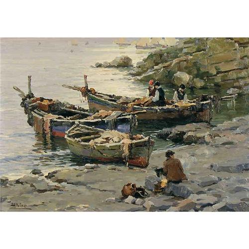 Italian [1884-1952] MENDING THE NETS, FISHING BOATS AT SHORE oil on board 10 x 14 in. (25.4 x 35.6 cm) signed